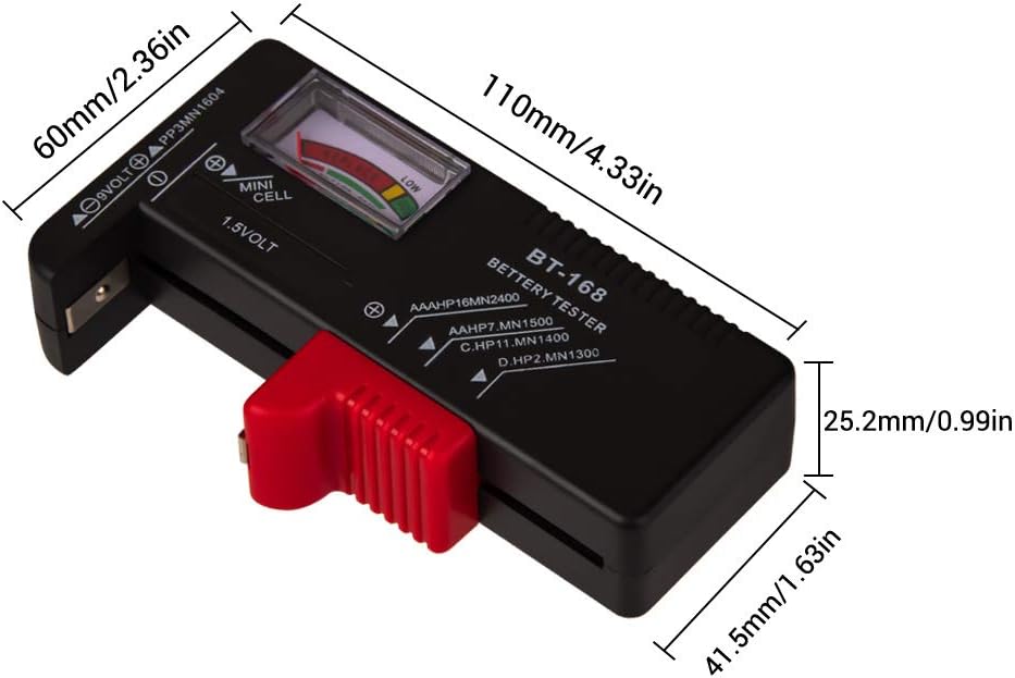 The universal battery tester works with standard and rechargeable household batteries: AA, AAA, C, D, 1.5V,9V and button type.