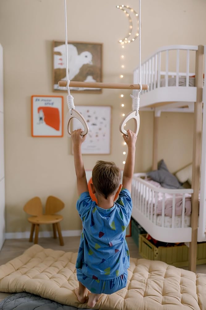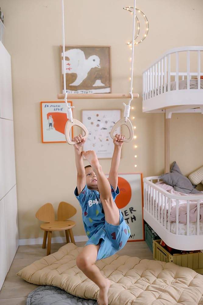 آمنة على الأطفال: تم تصنيع الأرجوحة ذات الحلقات باستخدام خشب الزان وخشب البتولا والحبل الطبيعي. تضمن أقفال الحبال الخشبية وأشرطة التعليق والحلقات المعدنية المصنوعة من النايلون أن تكون الأرجوحة ثابتة بشكل مثالي وآمنة للأطفال (تأكد مرة أخرى من أن جميع العقد والأقفال آمنة قبل الاستخدام). استمتع بها في الداخل والخارج، ولكن قم بتخزينها دائمًا في الداخل عندما لا تكون قيد الاستخدام، ولا تترك طفلك أبدًا دون مراقبة أثناء اللعب.