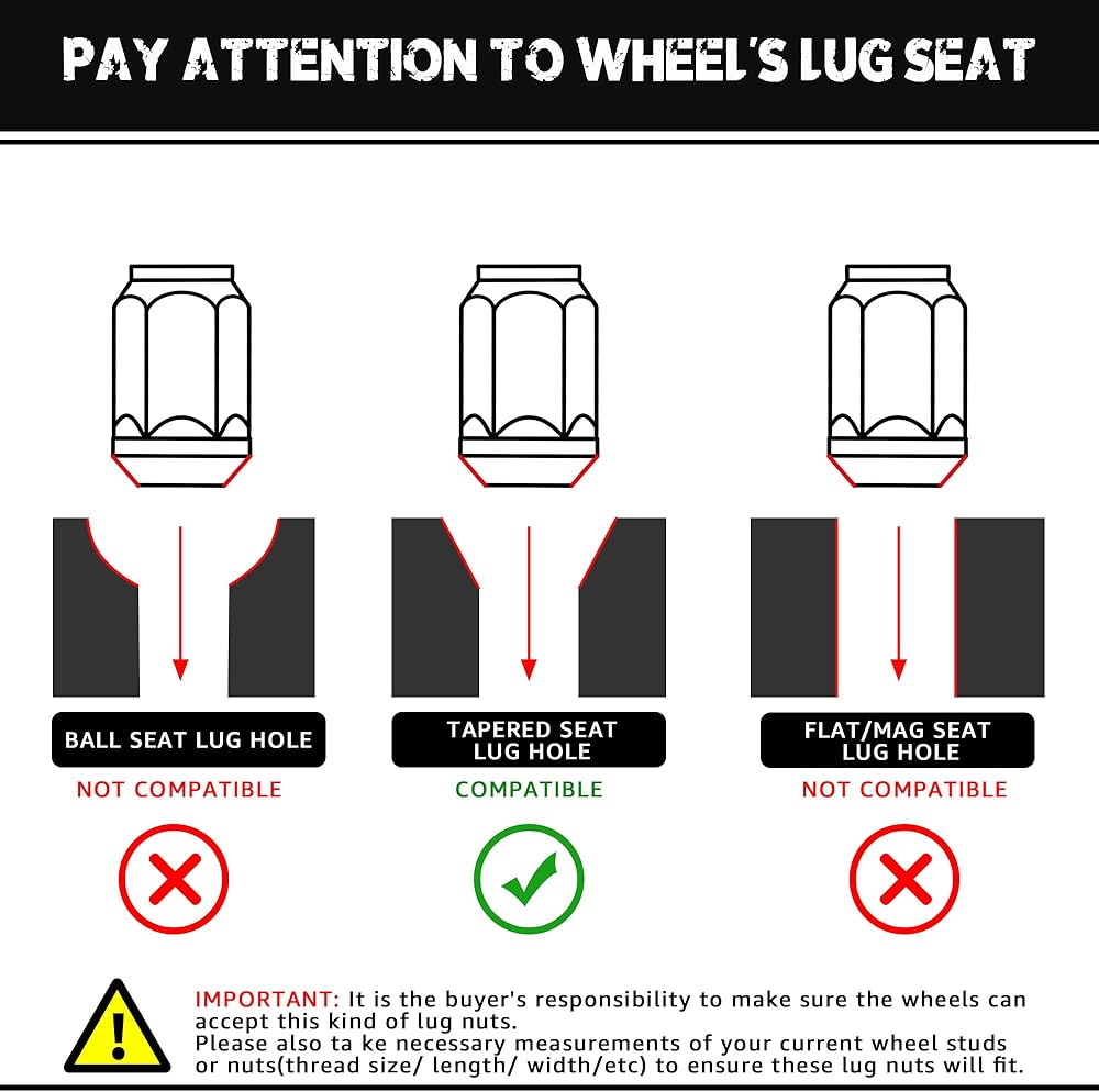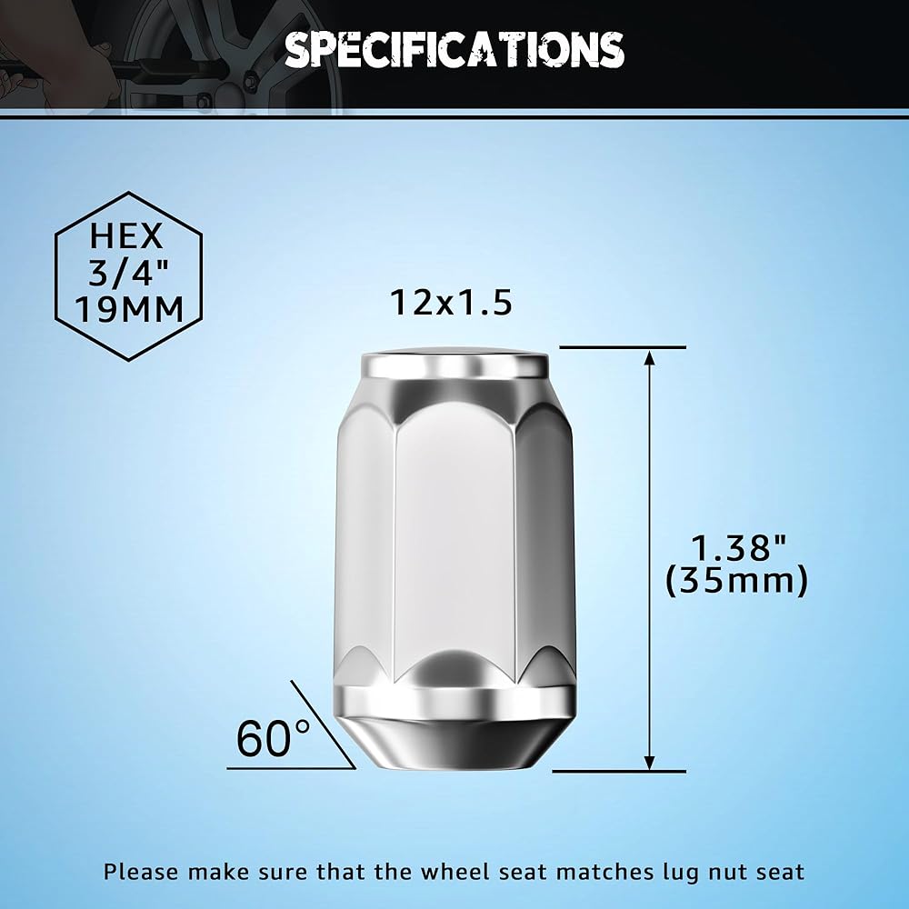 🔩【FITMENT】: Vehicles with wheel studs requiring a 12x1.5 thread,and wheels that take a conical 60 degree seat with a 3/4" hex, not fit mag seat,ball seat and round seat.(NOTE: Please tighten the lug nuts manually, DO NOT use electrical tools. )