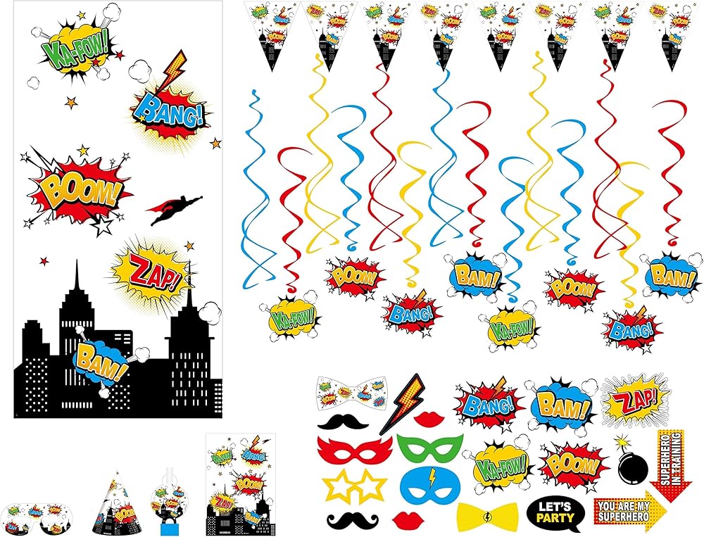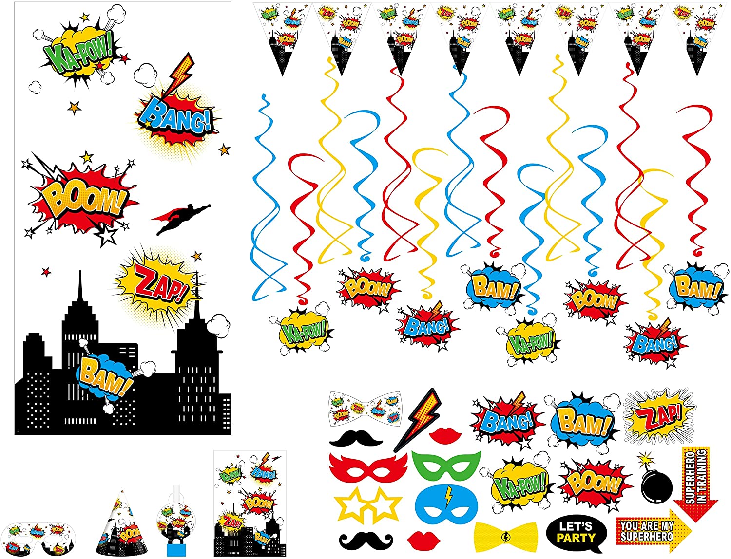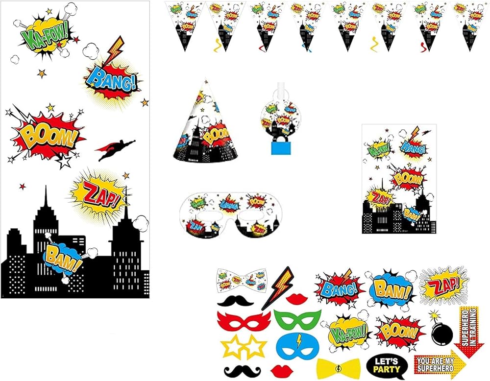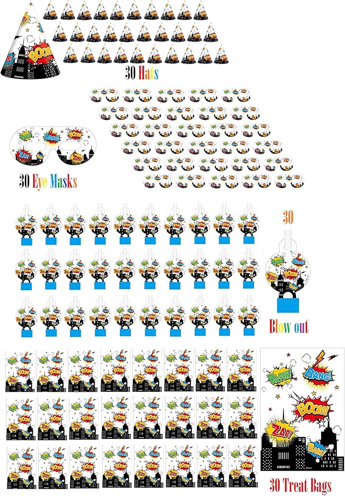 يقدم 30 حزمة كاملة للحفلات ذات طابع البطل الخارق وقبعات حفلات أعياد الميلاد وأقنعة العين وحقائب علاجية 20 قطعة من صور الدعائم DIY و14 دوامة و2 لافتة راية خلفية مثالية لحفلة عيد ميلاد البطل الخارق