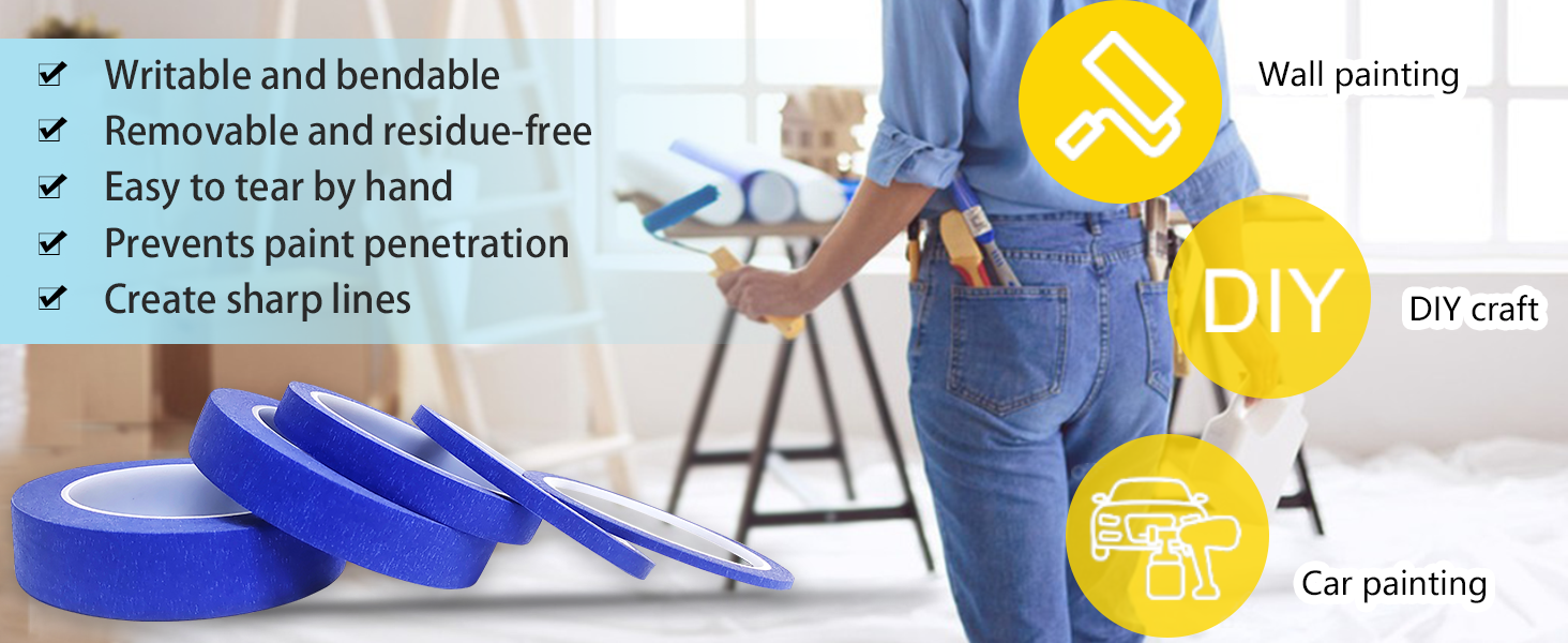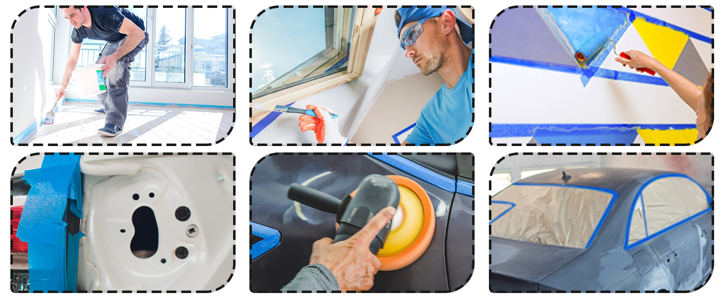 فائدة متعددة الاستخدامات: شريط الرسام قوي للغاية ويمكن استخدامه على مجموعة متنوعة من الأسطح في مجال صيانة السيارات وطلاء الجدران. يمكن استخدام شريط الرسامين للحفاظ على الطلاءات المتقاطعة على المعدات الرياضية، والمكونات المطاطية والبلاستيكية، وتزيين طلاء الجدران الداخلية والخارجية في مواقع البناء، والإخفاء أثناء الطلاء، وكعامل تجميل.