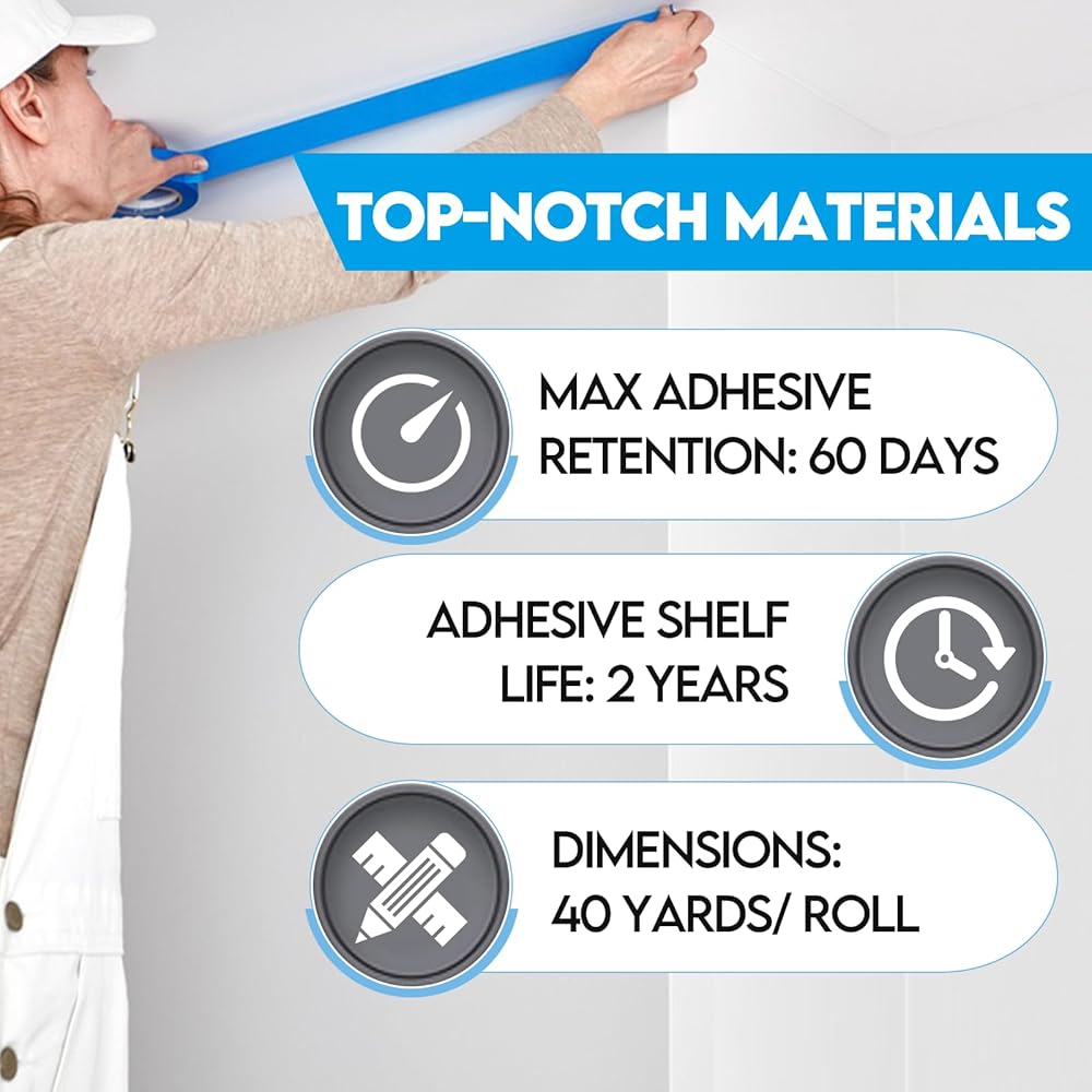 قابل للإزالة للغاية: شريط لاصق للرسامين بمادة لاصقة متوسطة يتم إزالته بشكل نظيف من أي سطح، بما في ذلك البلاستيك والخشب والمعادن والسيراميك والزجاج؛ ولا يترك أي بقايا خلفه عند إزالته. لفافات شريط الطلاء مصنوعة من ورق كريب غير سام وخالي من الأحماض وعديم الرائحة. إنه آمن تمامًا للاستخدام.