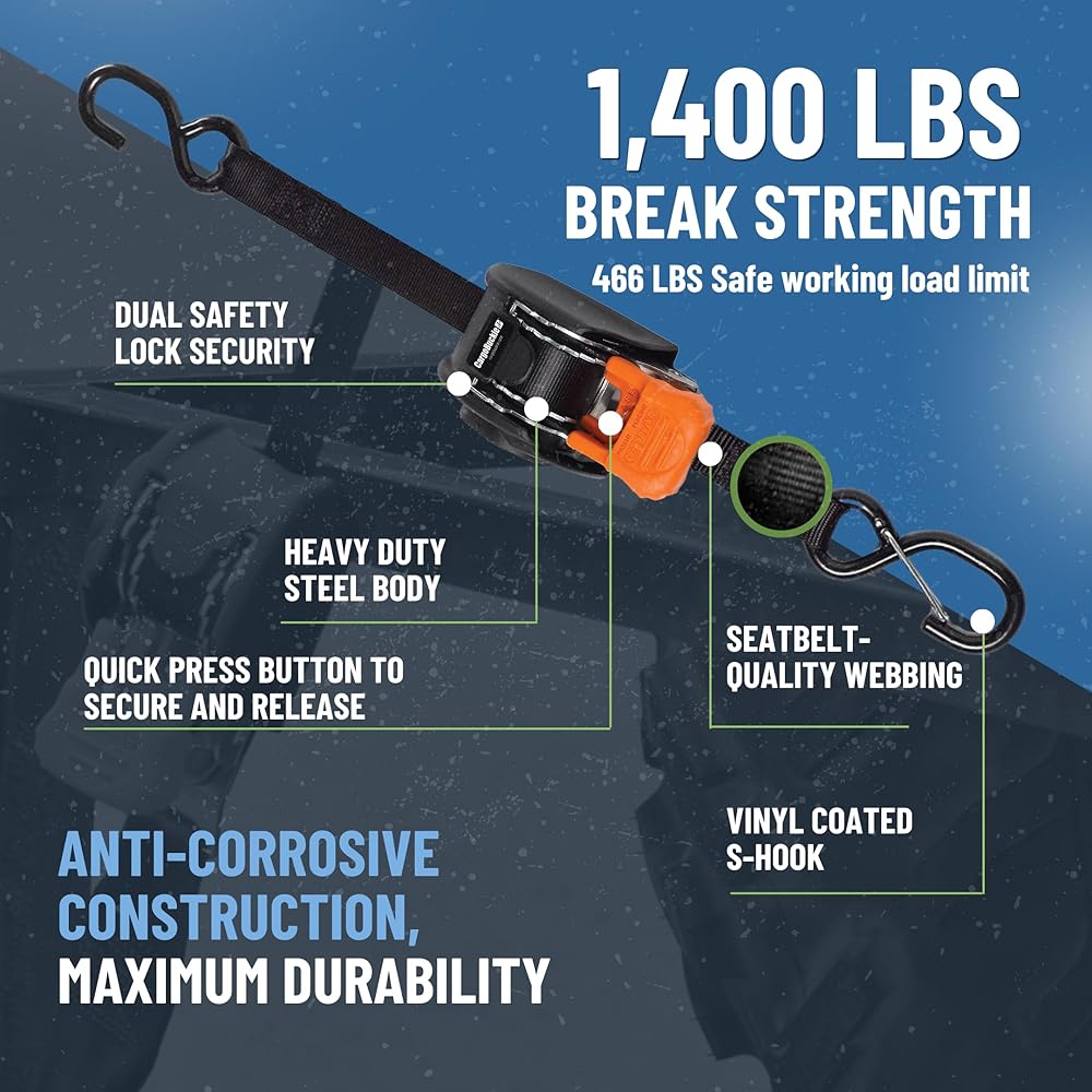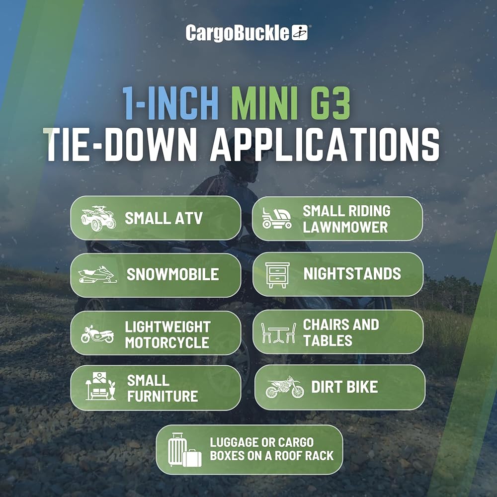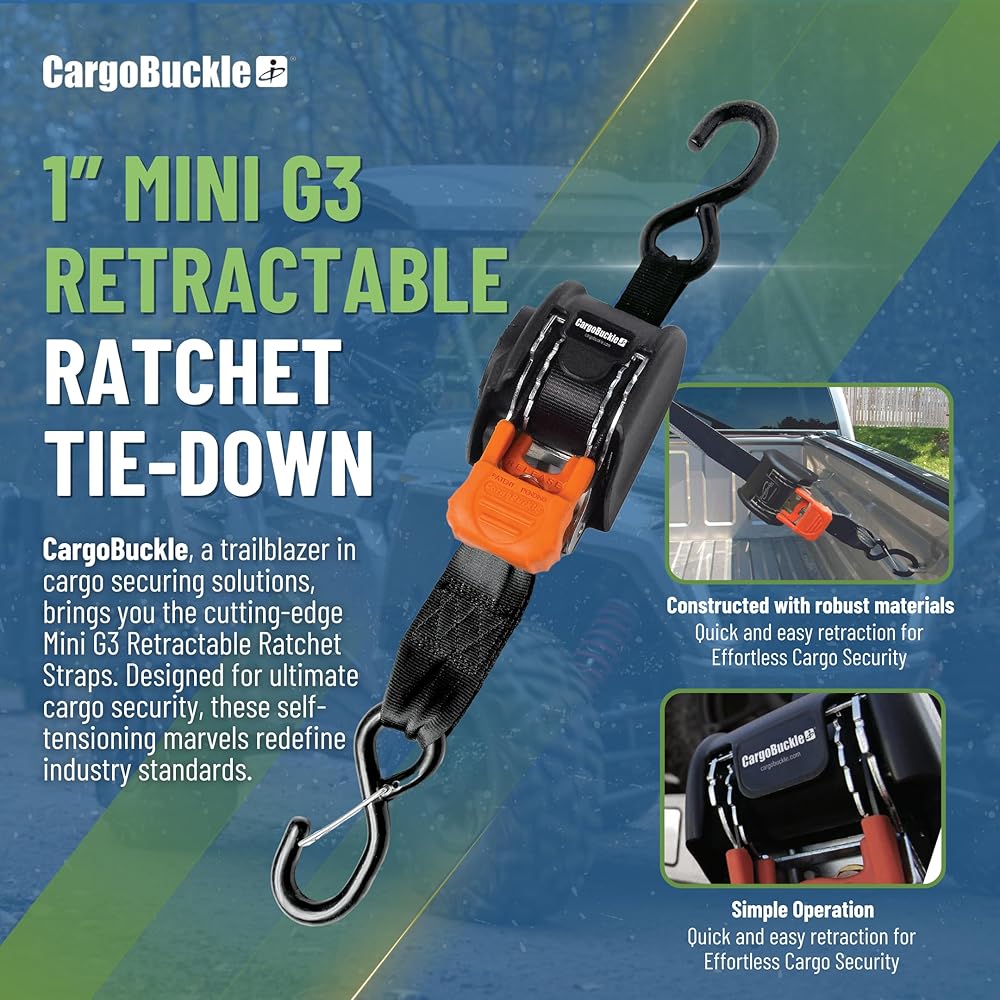 The CargoBuckle Mini G3 retractable ratchet tie-down system boasts six feet of one-Inch webbing which enables you to tie down more equipment in more applications, conveniently and securely. Each tie-down has a break strength of 1,400-Pound and a safe working load of 466-Pound. The CargoBuckle Mini G3 can be used on a trailer, toy hauler, cargo rack, lift, truck, ladder rack and in various other applications. CargoBuckle Brand Tie-Down Systems offer high quality, innovative solutions for securing and towing gear in the powersports, automotive, hardware, material handling and assisted living markets. From innovative retractable tie-down systems to custom strap assemblies, CargoBuckle products provide the utmost in durability and convenience.