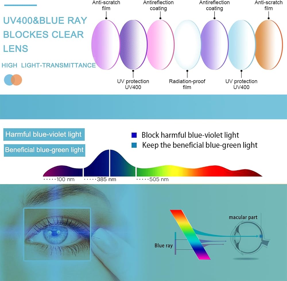 [عدسات عالية الجودة] - قوة التكبير الدقيقة تجعل منطقة الرؤية مفيدة. العدسات أكثر وضوحًا من العدسات العادية ولها دقة أعلى أيضًا، واستعادة اللون الحقيقي، والعدسات المضادة للضوء الأزرق والأشعة فوق البنفسجية 400 يمكنها تصفية الأشعة الزرقاء الضارة ووهج الأشعة فوق البنفسجية ، تجلب لك رؤية واضحة وتجلب لك أفضل تجربة قراءة.