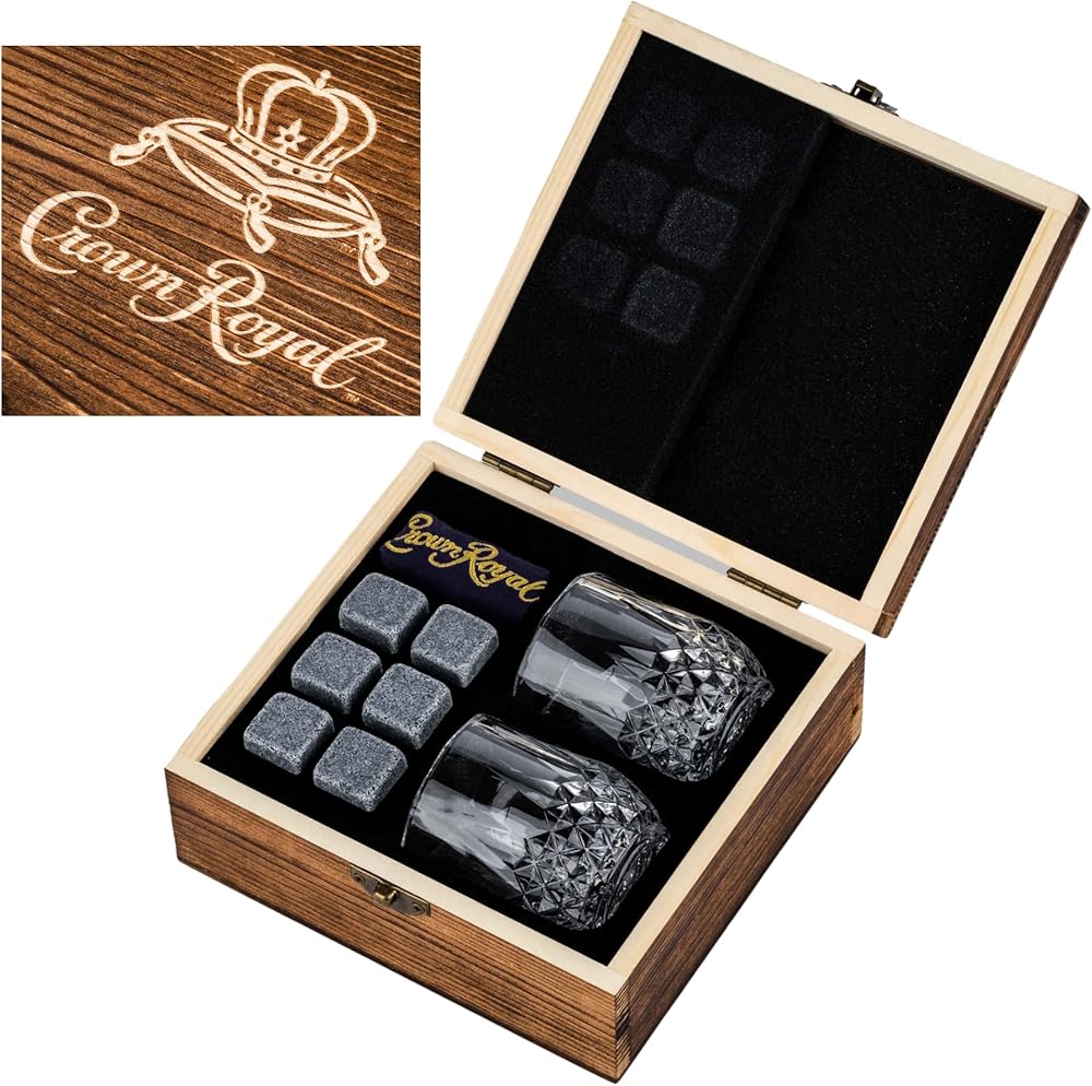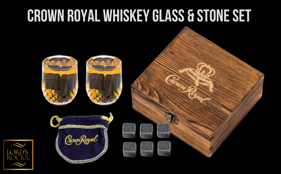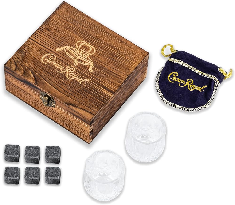 تشتمل المجموعة على كأسين بوزن 2.7 أونصة مع شعار Crown Royal، و6 أحجار ويسكي، وصندوق خشبي قابل للجمع، وحقيبة لحمل الأحجار.