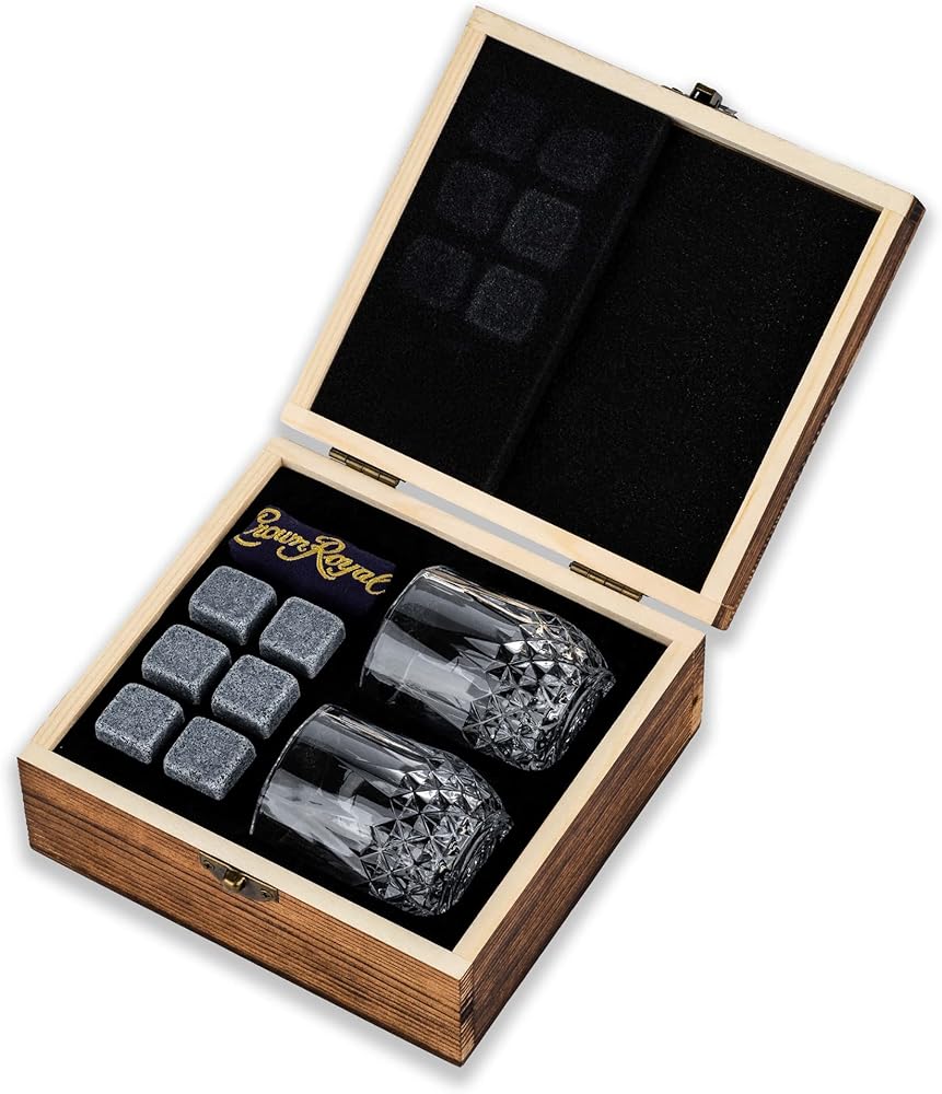 هدايا الويسكي لعيد الأب للرجال مجموعة من زجاج وحجر التاج الملكي من بوربون | مجموعة صندوق خشبي مكون من 2 كؤوس بحجم 2.7 أونصة مع 6 أحجار تبريد من صخور الويسكي | تتضمن الحقيبة المخملية ذات التاج الملكي المتوافقة