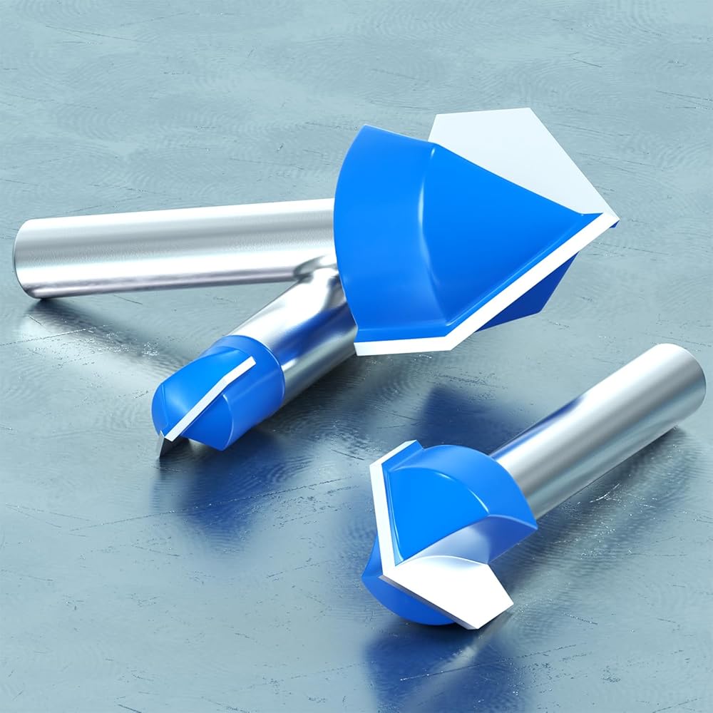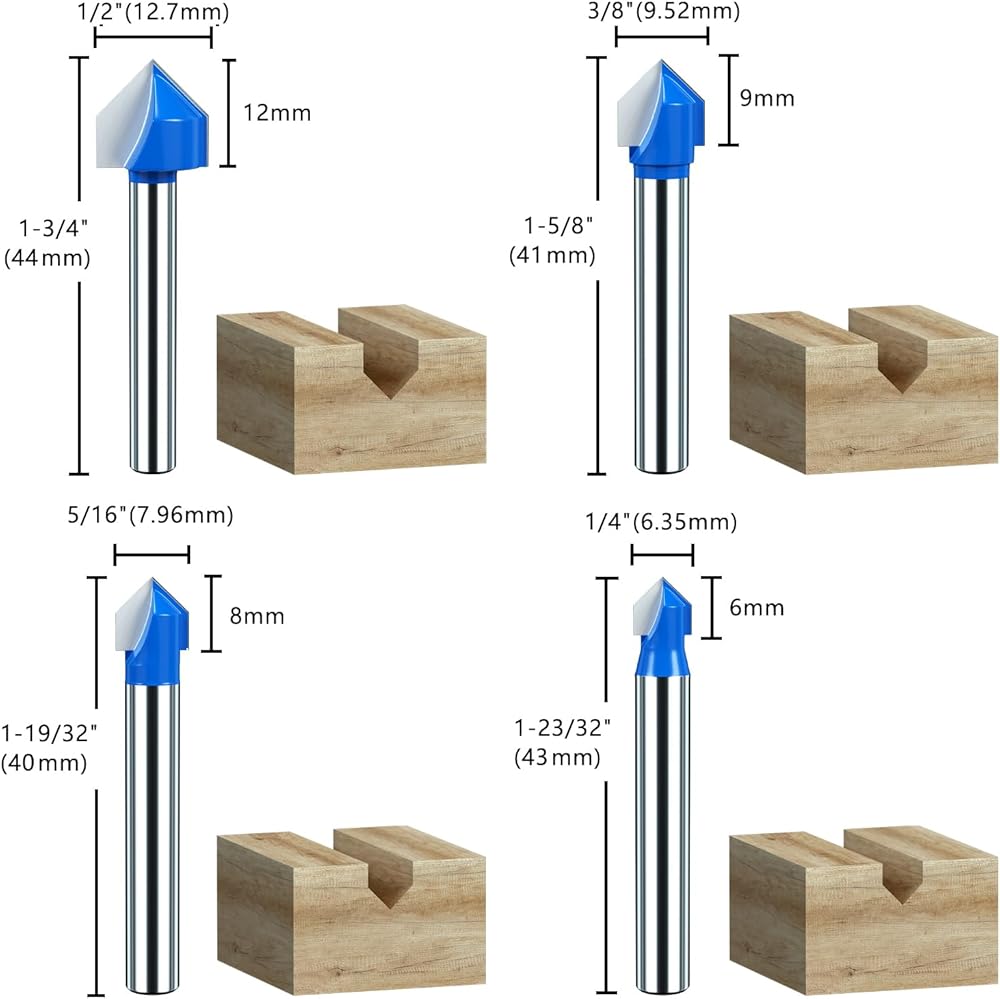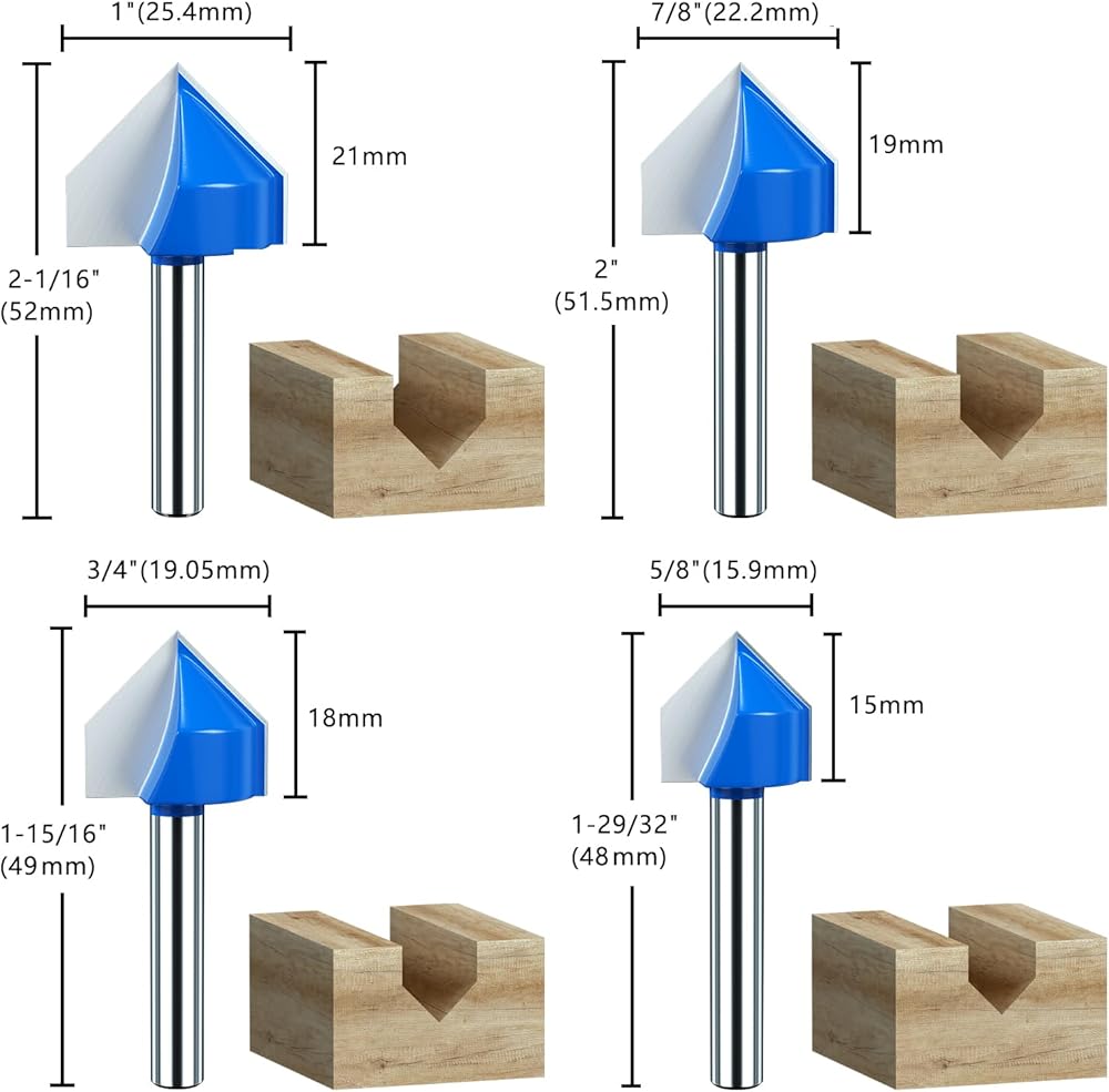 8 Pcs 1/4 Inch Shank 90 Degree V Groove Router Bit; Cutting Diameter: 1/4", 5/16", 3/8", 1/2", 5/8", 3/4", 7/8", 1" ; V-Groove Bit is designed to cut deep or shallow V grooves.