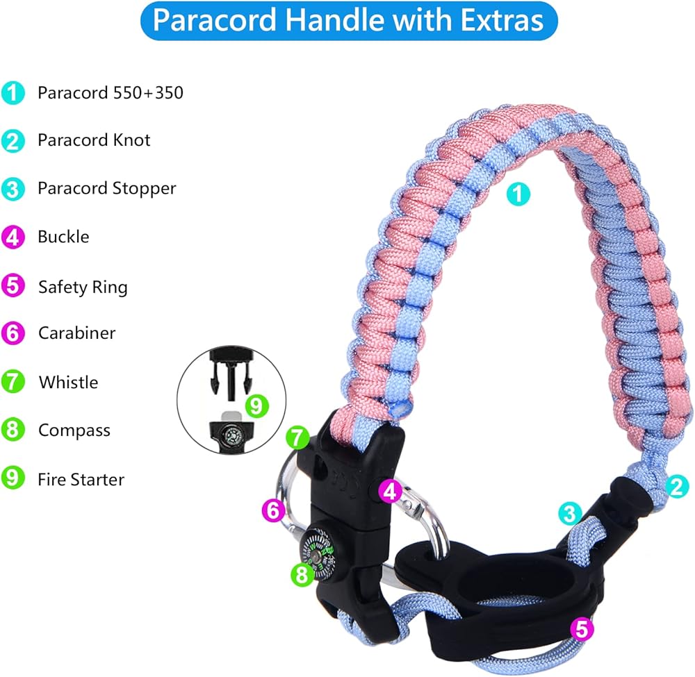 جودة عالية: حزام باراكورد لزجاجة المياه هذا مصنوع من نايلون عسكري عالي الجودة 550+350 وهو متين ويديك أكثر راحة عند حمل المقبض. حلقة أمان مصنوعة من مطاط البولي إيثيلين (PE) الذي يوفر أمانًا إضافيًا.