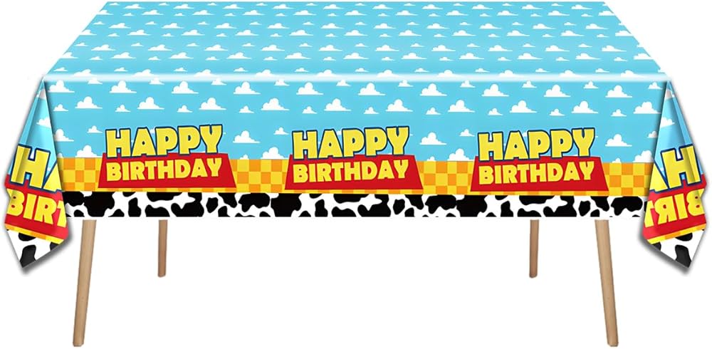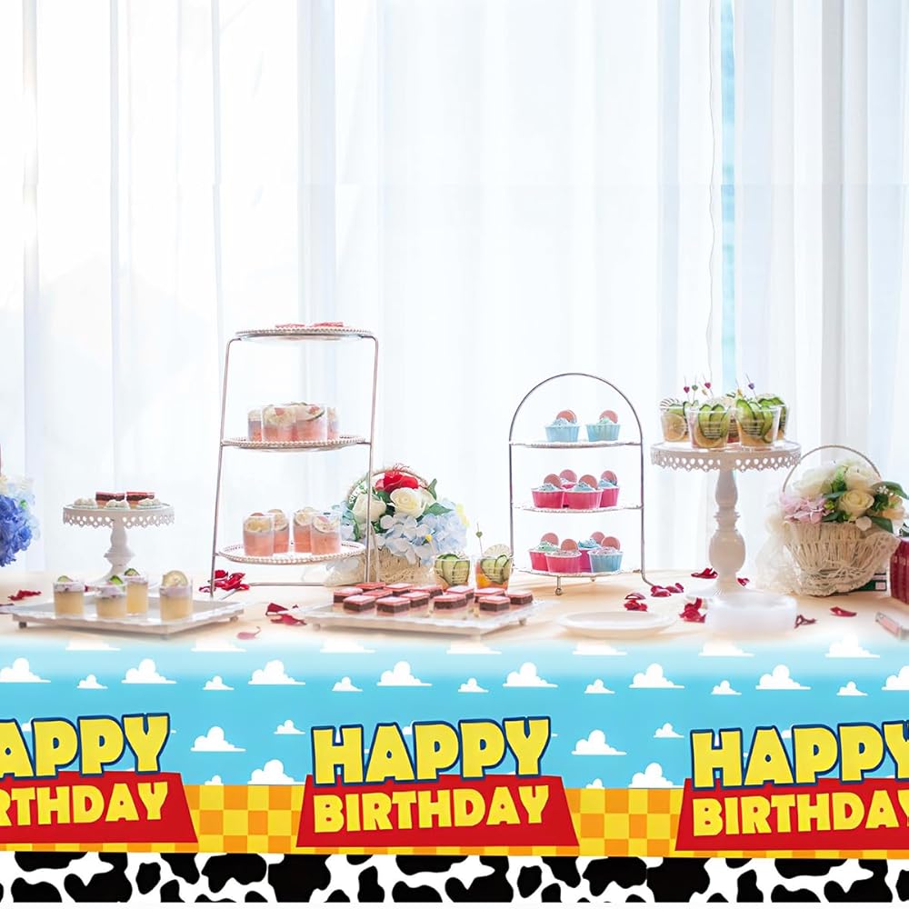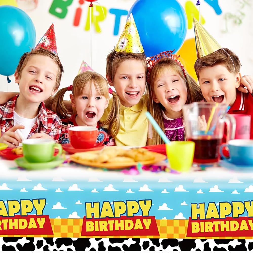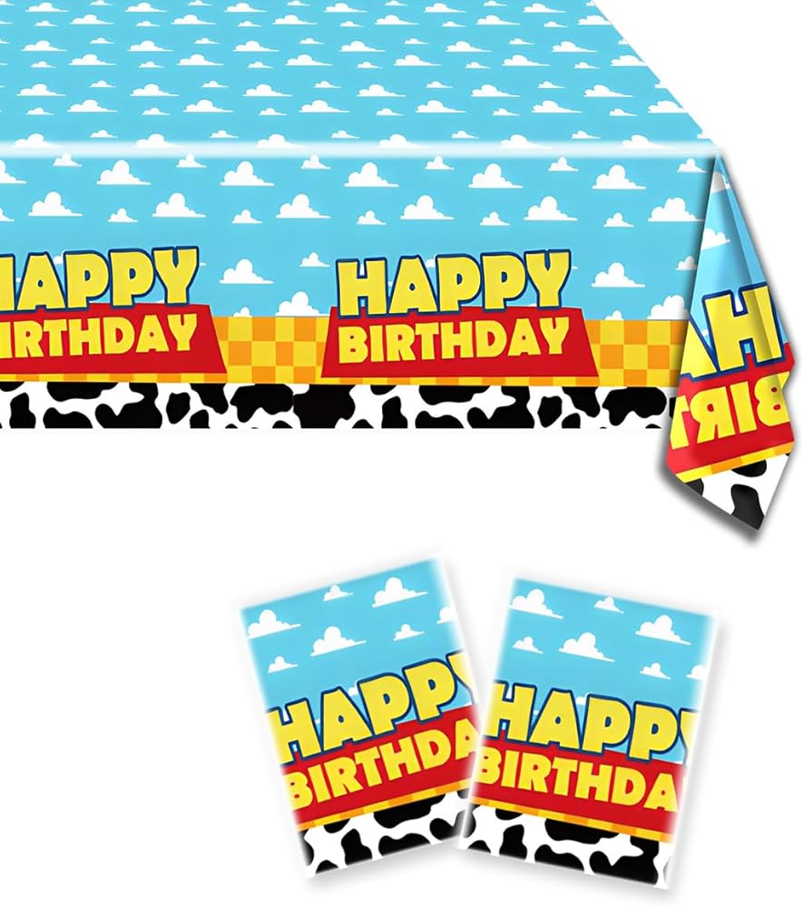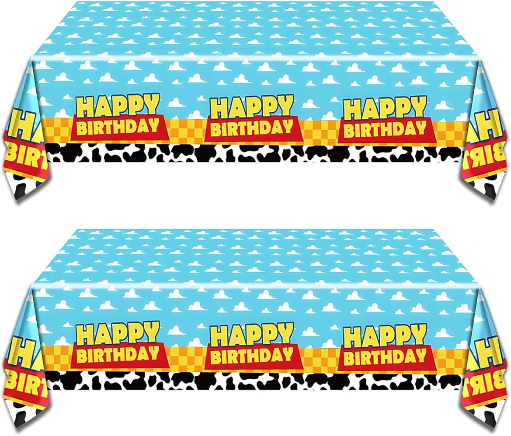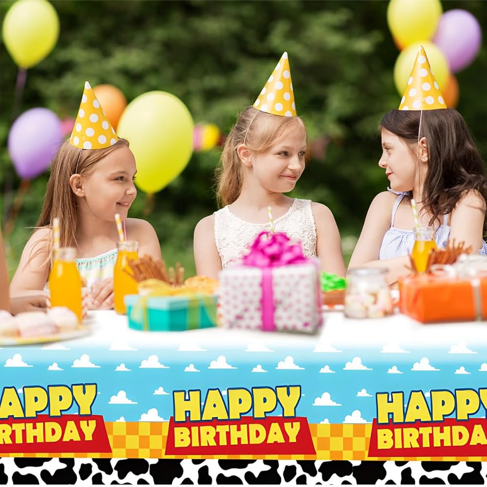 OULUN 2 قطعة من لوازم حفلات أعياد الميلاد ذات القصة الكرتونية، مقاس 54 بوصة × 108 بوصة، غطاء طاولة مطبوع بنمط البقرة، السماء الزرقاء والسحابة البيضاء، مفارش المائدة لتزيين حفلات عيد ميلاد البقرة