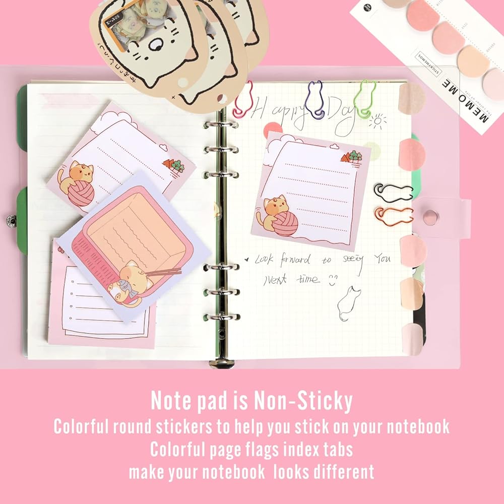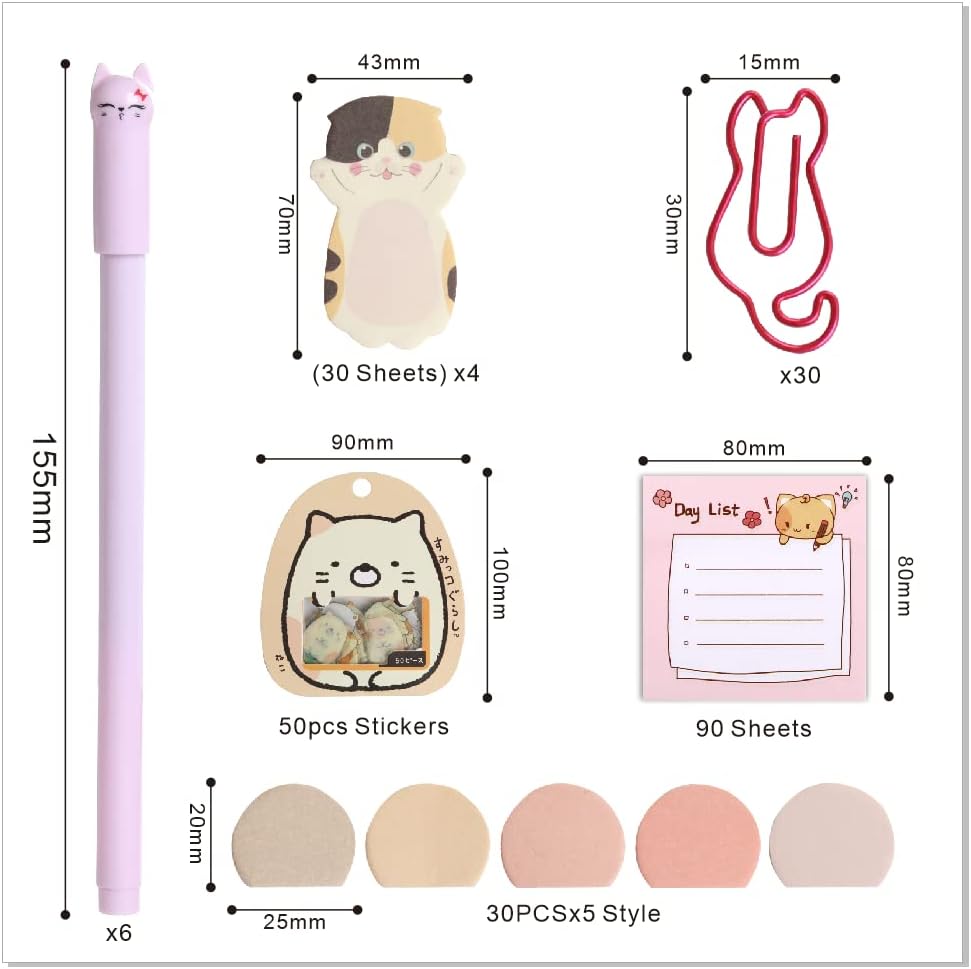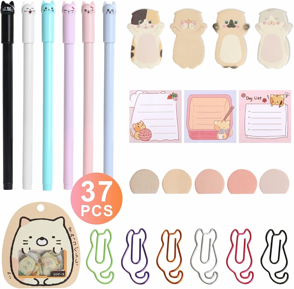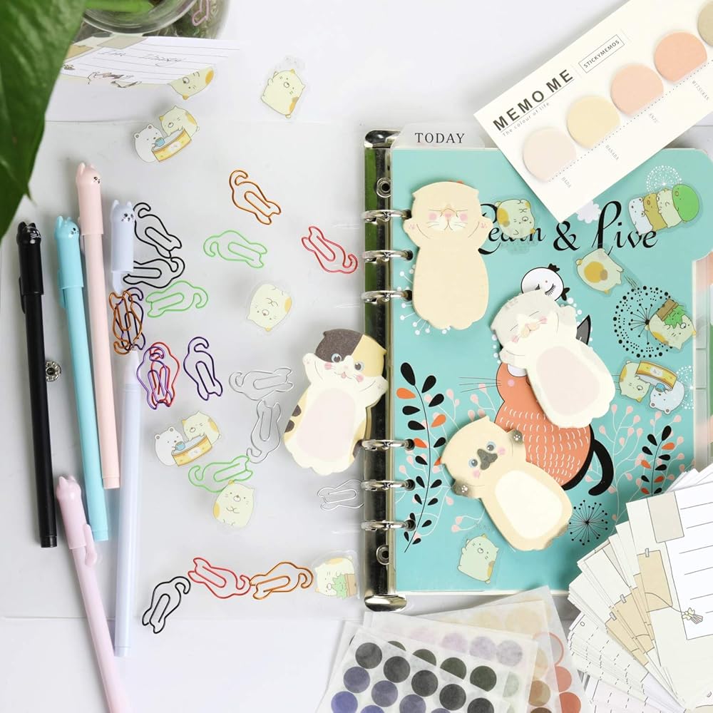 🐾Colorful Cat Design Gel Pen Black Ink, 0.5mm pen lead;6 Color Cat Paper Clips& Sticky Flags;Silhouette Cat Sticky Notes;Kitty Stickers