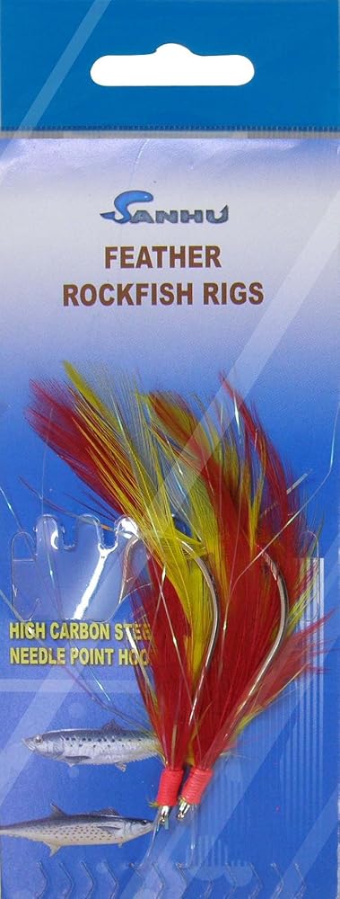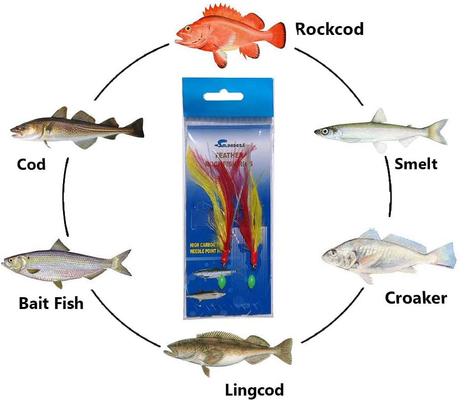 Here are 10 packs of 3/0 Red/Yellow Rock Cod Feather Rigs. The ROCK COD RIGS are good at catching rockfishes. Attach enough weight to the snap swivel so the rig can be lowered to the bottom. For best results, use a lead or metal bar type jig as your weight, or attach small pieces of squid to the hooks themselves. A slow vertical jigging motion will induce the most strikes. From Mexico to the Pacific Northwest and Florida up through Canada, these rigs are widely used by anglers for vertically jigging cod, rockfish, batfish, smelt, croaker and various similar fish. Swivels attach at each end of rig. The strengths (lb.- test) of main line is 60lb and branch lines is 30lb. All rigs are supplied in a convenient "One-Pull" dispenser package.