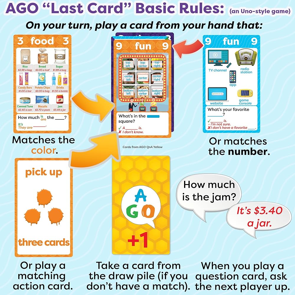 • لعبة ممتعة - هناك العديد من الطرق للعب AGO. تضيف بطاقات الحركة (مثل القفز والالتقاط وتغيير اللون وما إلى ذلك) المزيد من المتعة. تعتبر ألعاب الورق هذه طريقة بديهية للطلاب لاكتشاف كيفية عمل اللغة الإنجليزية من خلال المحادثة واللعب! إنها غنية بالكلمات المرئية والكلمات ذات التردد العالي، وهي أيضًا ممارسة قراءة جيدة للقراء الناشئين.