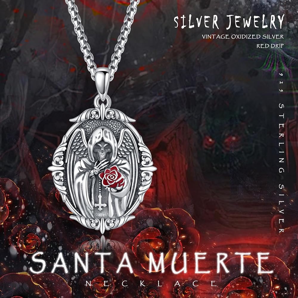✅【صناعة عالية الجودة】- قلادة سانتا مويرتي الجميلة هذه مصنوعة من الفضة الإسترلينية عيار 925 (منقوشة "S925")، والسلسلة مصنوعة من الفولاذ المقاوم للصدأ، وخالية من النيكل والرصاص ولا تسبب الحساسية. شكل Grim Reaper الرائع والسطح المؤكسد وتصميم الوردة الحمراء يجعل مجوهرات قلادة Grim Reaper المصنوعة من الفضة الإسترلينية أكثر جاذبية.