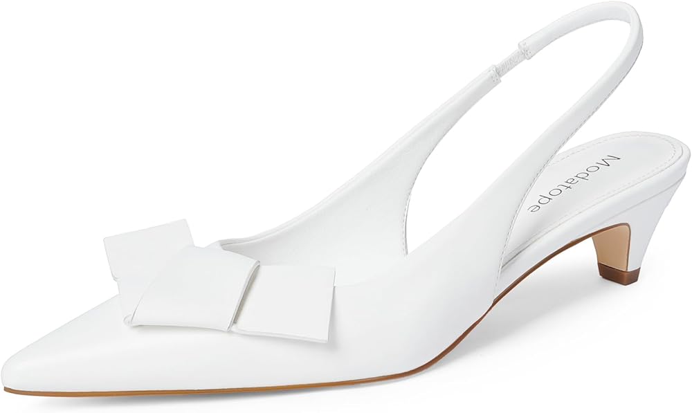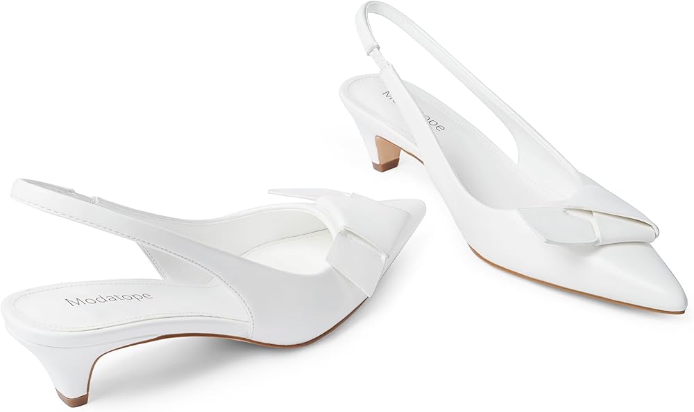 【كعب على شكل فيونكة للقطط】: كعب قطط أبيض مع مقدمة كلاسيكية مغلقة، وظهر منزلق وتصميم كعب قطط، هذا الكعب المنخفض يبقيه ممتعًا مع مقدمة مدببة وتفاصيل قابلة للطي على شكل فيونكة.