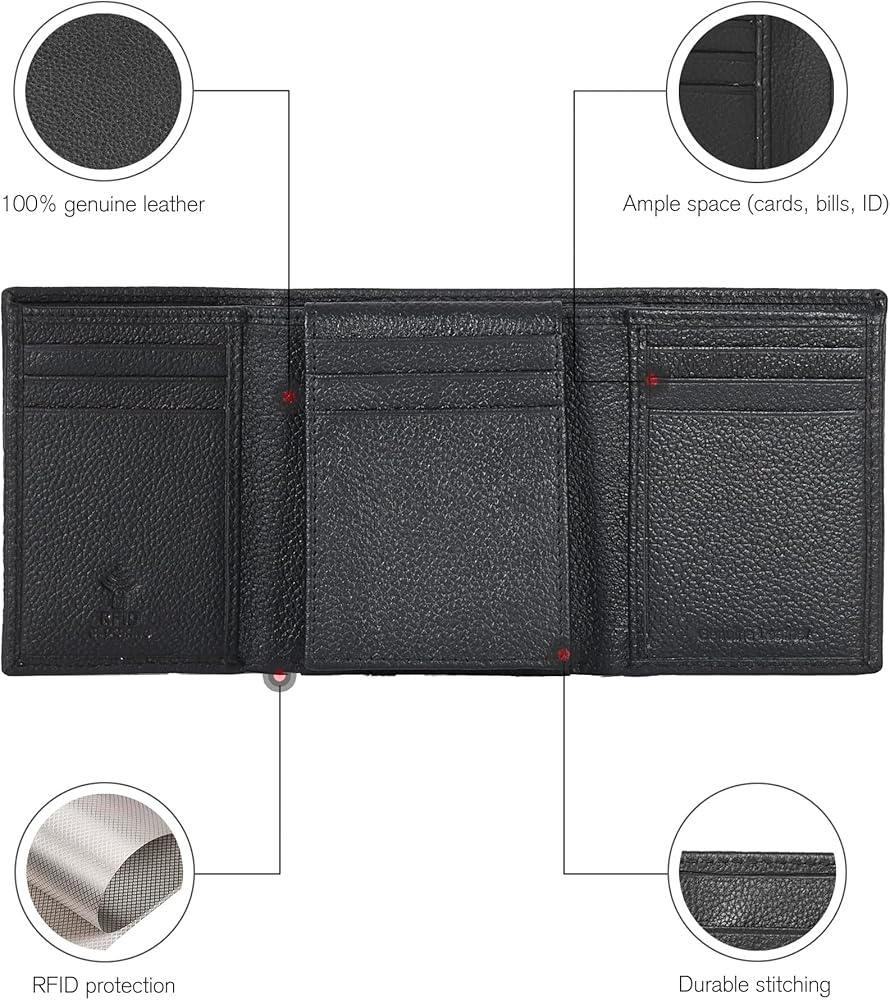 • جلد عالي الجودة: مصنوعة من الجلد الأصلي بنسبة 100%، محافظنا ثلاثية الطي قوية ومتينة ومصممة لتدوم طويلاً.