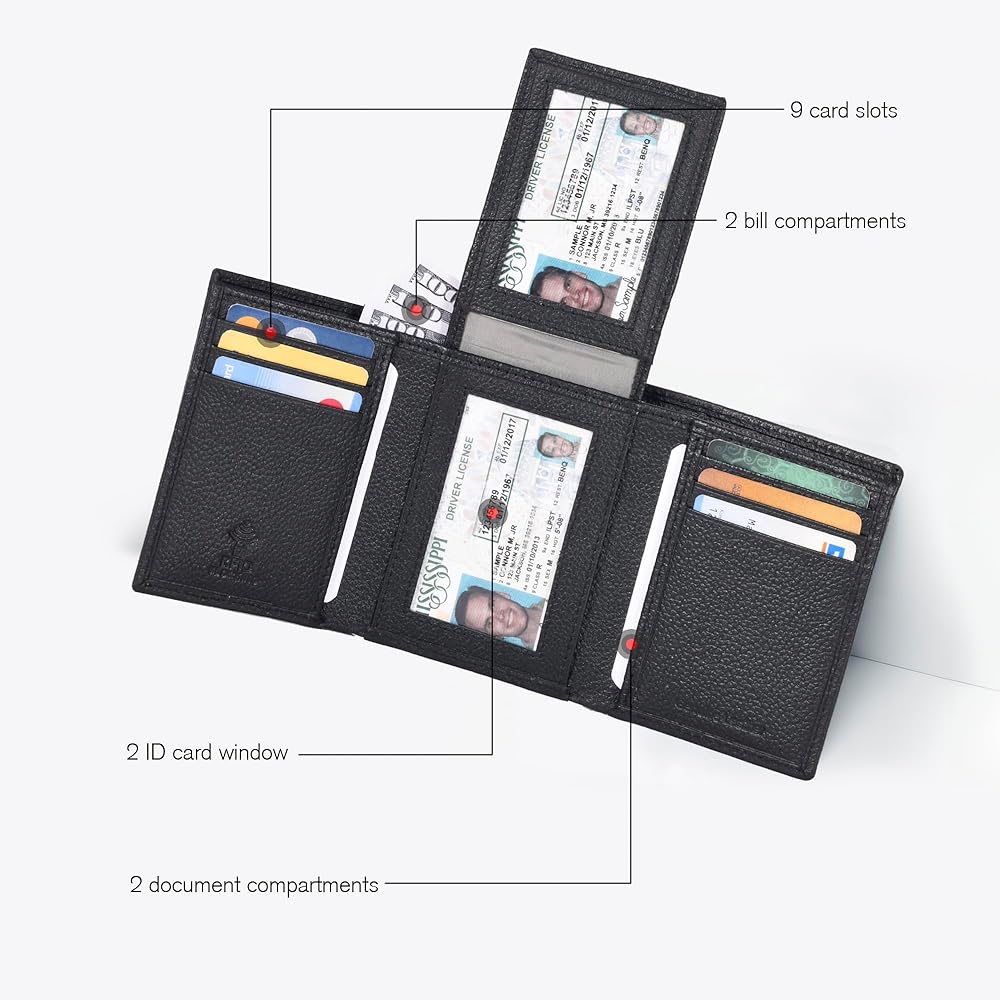 • حلول تخزين ذكية: تتميز محفظتنا المصممة بذكاء بخيارات تخزين مريحة، بما في ذلك نافذة لبطاقة الهوية، وفتحات لبطاقات الائتمان، وجيوب للعملات، وجيوب منزلقة للمستندات - كل ذلك في تصميم أسود نحيف.