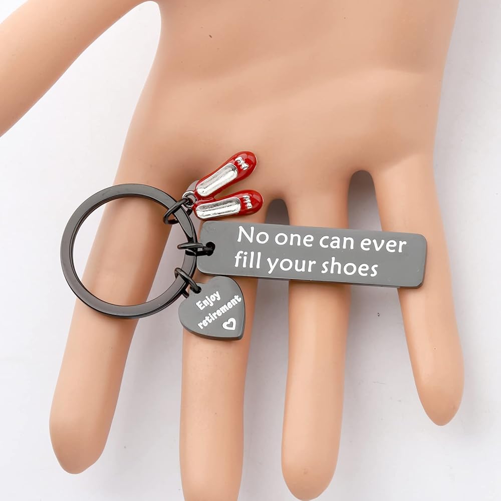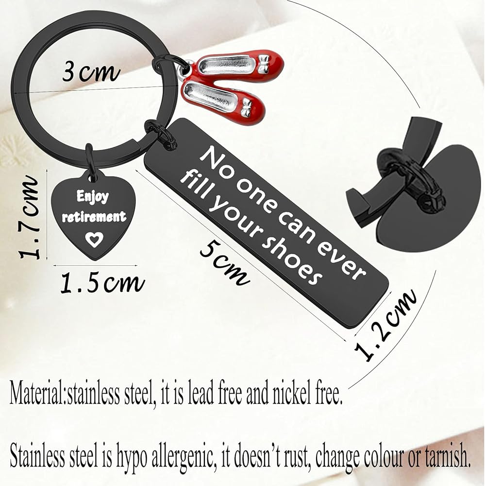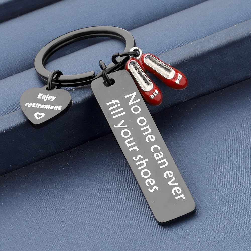 Beautiful No One Can Ever Fill Your Shoes Enjoy Retirement charm keychain is a unique design and makes a great gift for ladies!It will make a lovely gift, keepsake for any Lady who is going to rest! Any profession Eg. Teacher, Office worker, Cook, Doctor, Nurse, Carer, Baby sitter etc.