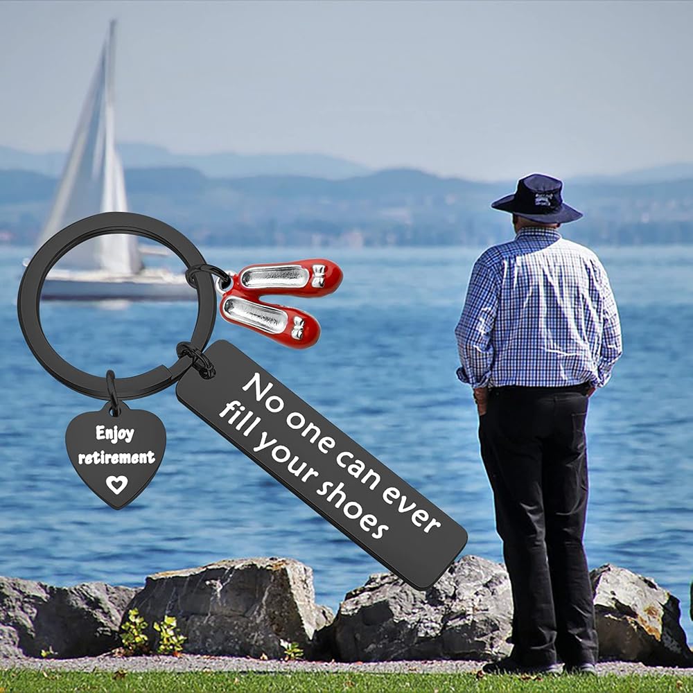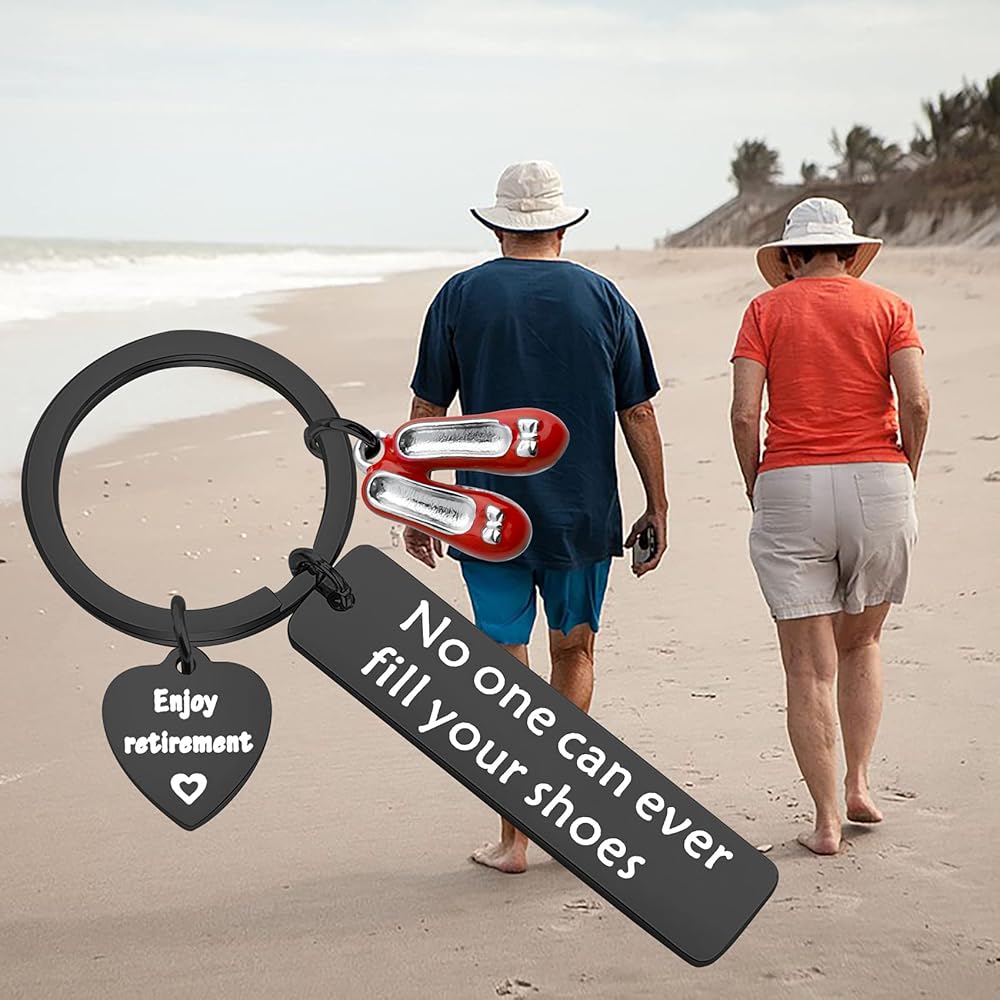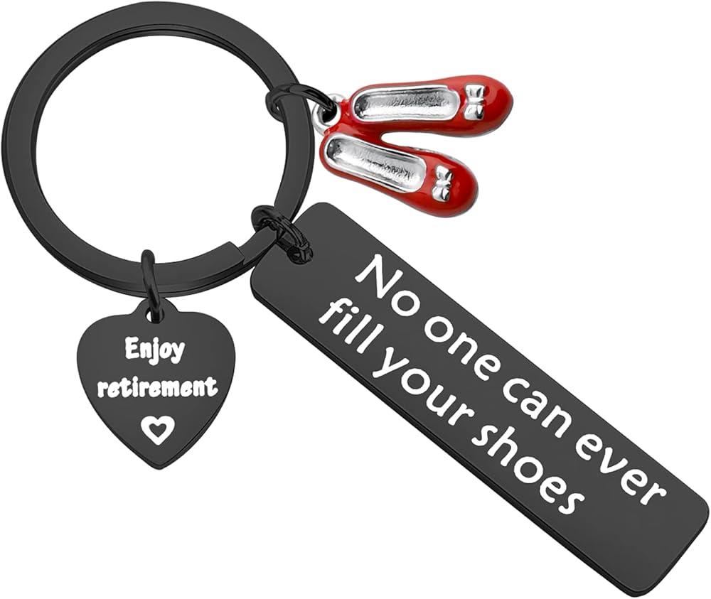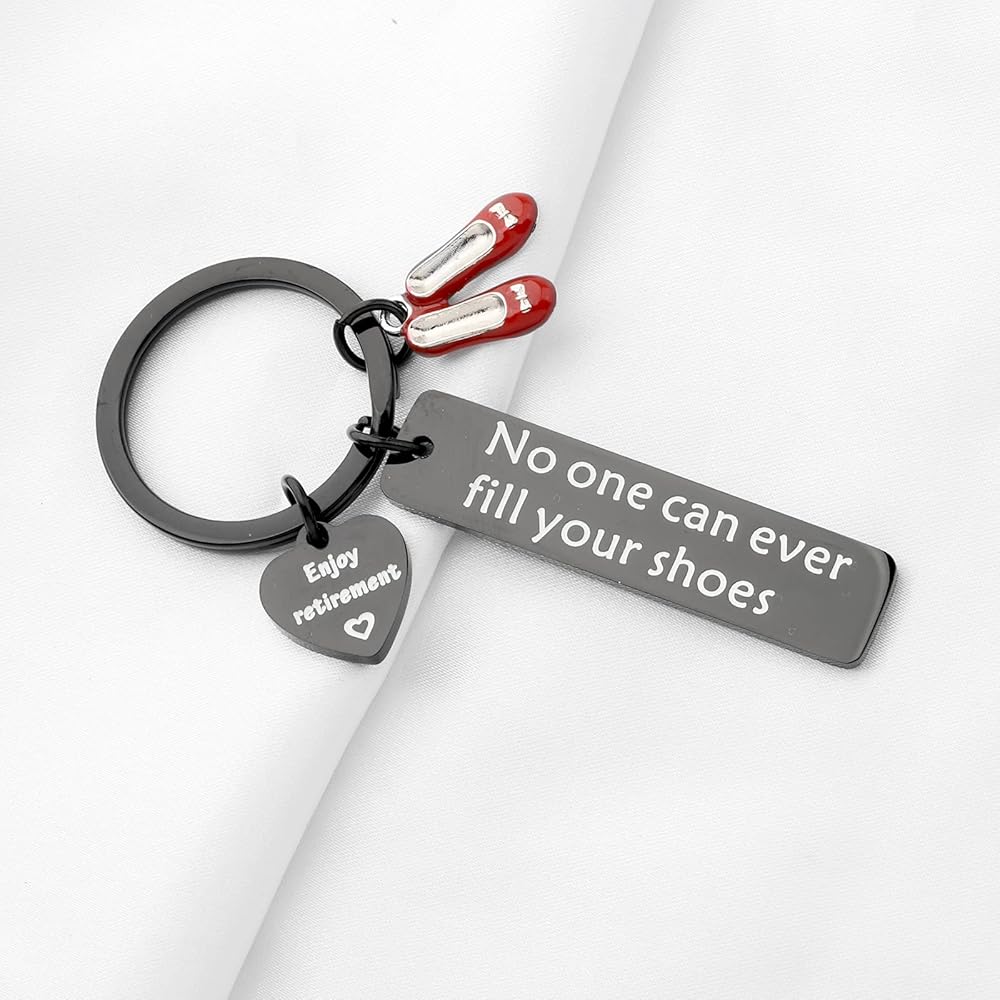 Beautiful No One Can Ever Fill Your Shoes Enjoy Retirement charm keychain is a unique design and makes a great gift for ladies!It will make a lovely gift, keepsake for any Lady who is going to rest! Any profession Eg. Teacher, Office worker, Cook, Doctor, Nurse, Carer, Baby sitter etc.