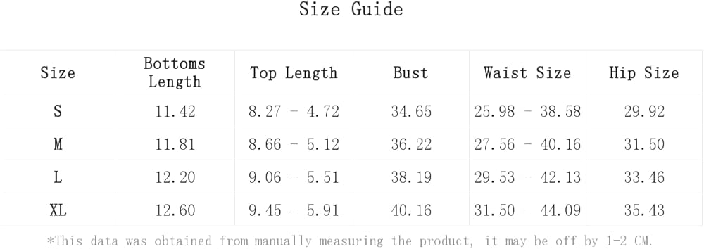 XL:Bottoms Length:12.6IN,Hip Size:35.4IN,Waist Size:31.5-44.1IN,Bust:40.2IN,Top Length:9.4/5.9IN