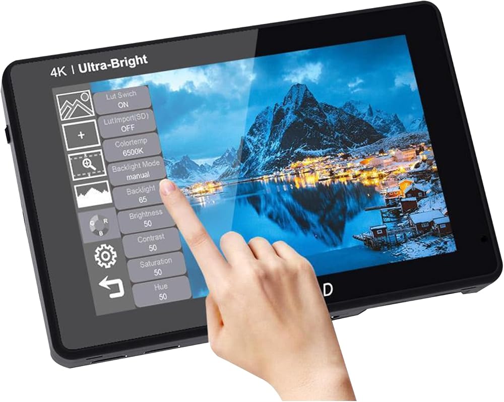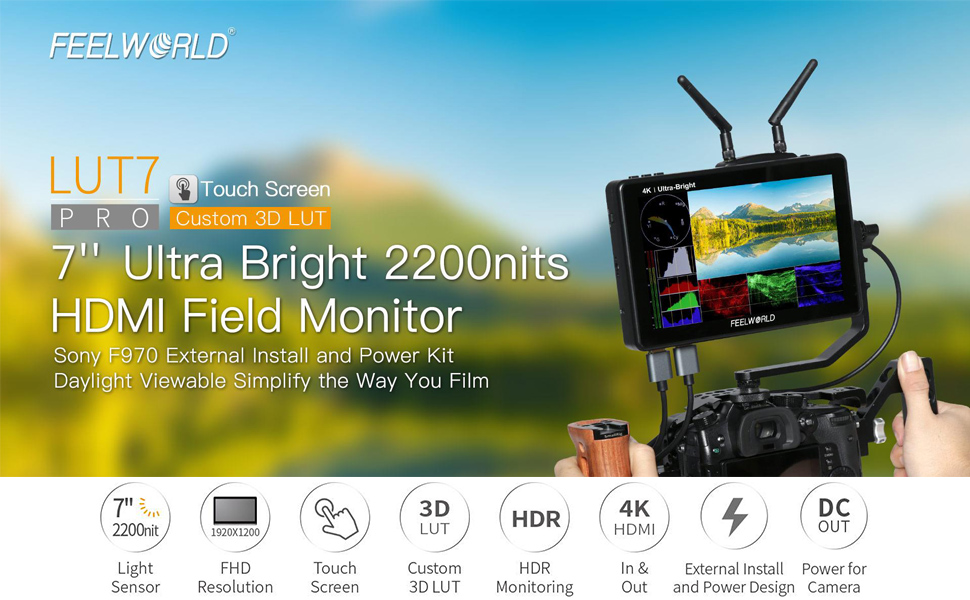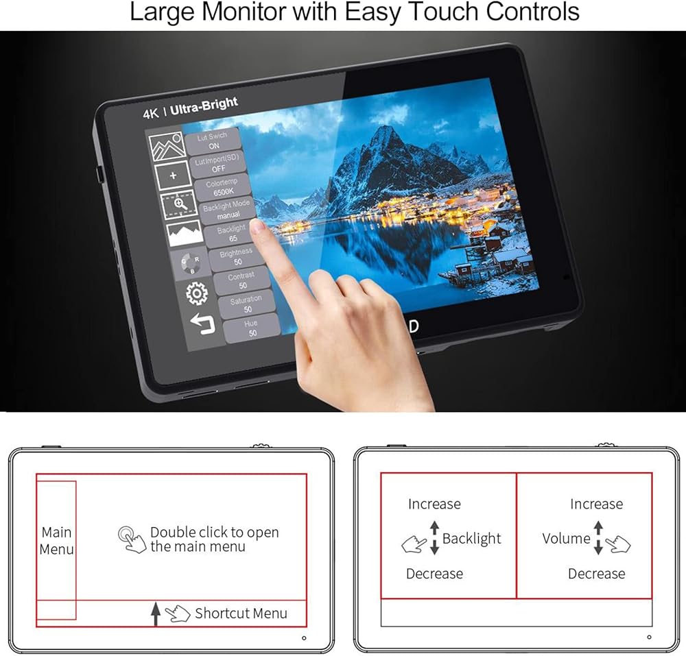 【2200nit فائقة السطوع وضبط السطوع التلقائي】تتميز الشاشة مقاس 7 بوصات 1920 × 1200 بدرجة سطوع عالية تبلغ 2200nit. وهذا يجعل من السهل التصوير في الهواء الطلق في ضوء النهار الساطع بدون غطاء! تحتوي الشاشة على مستشعر الإضاءة المحيطة، مما يؤدي إلى زيادة سطوع الشاشة لتعويض ضوء الشمس الساطع عند استخدامها في الهواء الطلق، بينما تكون الشاشة الخافتة أكثر راحة للعين عند المشاهدة في الظلام. يمكن ضبط الإضاءة الخلفية (1~100) يدويًا.