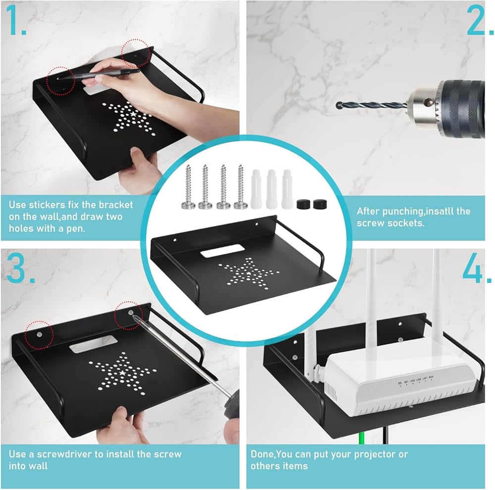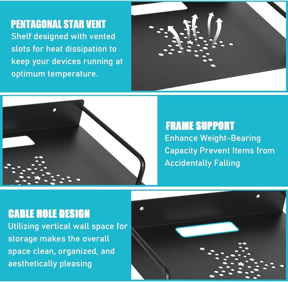 💝【Easy to install】: The wall-mounted floating router rack is installed with punched screws, which supports heavy items and is more stable. It is suitable for uneven walls such as painted walls, wallpaper walls, cement walls, and plastered walls. We also designed five-pointed star vents to increase the ventilation of the wall mount, allowing the heat of projectors/Wifi routers/modems and other equipment to better dissipate, thereby maintaining equipment stability and reducing power consumption.