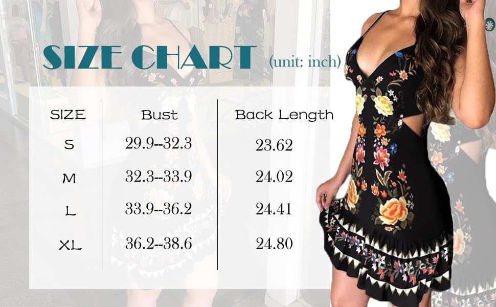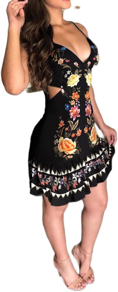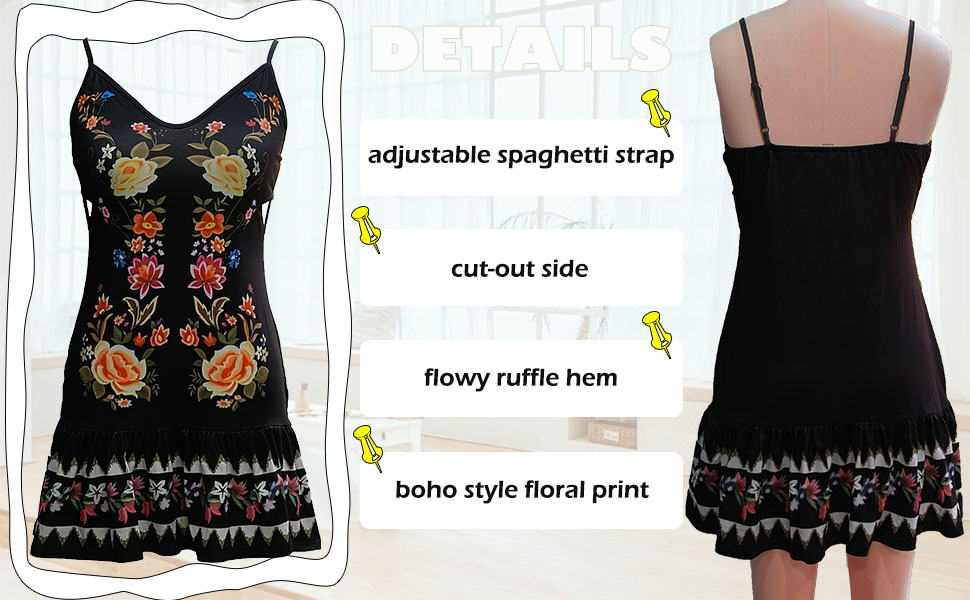 السمات------بدون أكمام، حزام سباغيتي قابل للتعديل، رقبة عميقة على شكل حرف V، جوانب مقصوصة، حاشية مكشكشة، طباعة زهور، فستان الحفلات الصيفي هذا مكشكش للنساء، فستان الشمس النسائي بشريط سباغيتي عصري للغاية ومثالي للصيف.