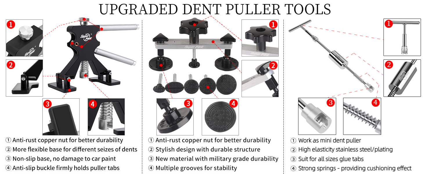 ترقية جديدة: يختلف عن معظم أدوات إصلاح الانبعاجات في السوق، فقد أضفنا مطرقة تسوية جديدة، والقوة سهلة التحكم، دون الإضرار بالطلاء الأصلي، ويمكنها إصلاح الخدوش ونتوءات الجسم بشكل فعال. وفي الوقت نفسه، أضفنا أيضًا أربع عروات سحب طويلة 2 في 1 على شكل حرف T، وهي سميكة وليس من السهل كسرها. في نفس الوقت، يتم تقوية التصاق عصي الغراء الخاصة بنا، ويمكن تطبيقها على إزالة الخدوش في الوضع الصعب لجسم السيارة. ولكن في حالة تلف الطلاء الأصلي أو ترقيعه أو إعادة طلاءه، أو إذا تم تشميع السيارة، فلا يُنصح باستخدام مجموعة أدوات سحب الانبعاج.