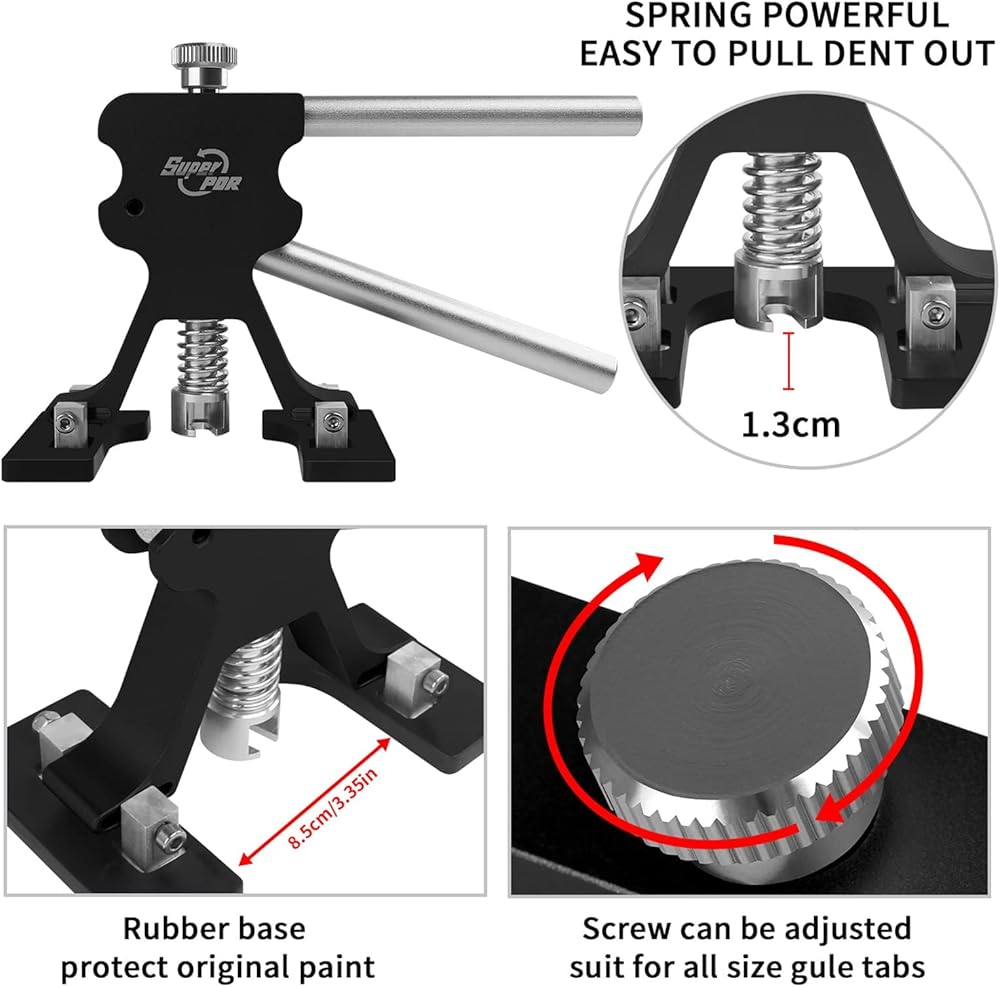 إصلاح الخدوش بجميع الأحجام: أدوات إصلاح الخدوش لدينا مناسبة لجميع أحجام الخدوش المختلفة. رافع دنت يمكن إصلاح الخدوش 1-4 بوصة. تأتي مع وسادات قدم مطاطية قابلة للتعديل، والتي لا يمكنها فقط ضبط العرض والارتفاع حسب الرغبة، ولكن أيضًا تمنع الانزلاق وتحمي طلاء سيارتك من التلف. يمكن لأداة سحب دنت الجسر إصلاح الخدوش في غضون 7 بوصات. يمكن استخدام أداة السحب على شكل حرف T 2 في 1 في الخدوش الكبيرة تقريبًا. كما يمكن تفكيكها إلى أداة سحب قصيرة على شكل حرف T للاستخدام، وهي مريحة وفعالة للغاية.