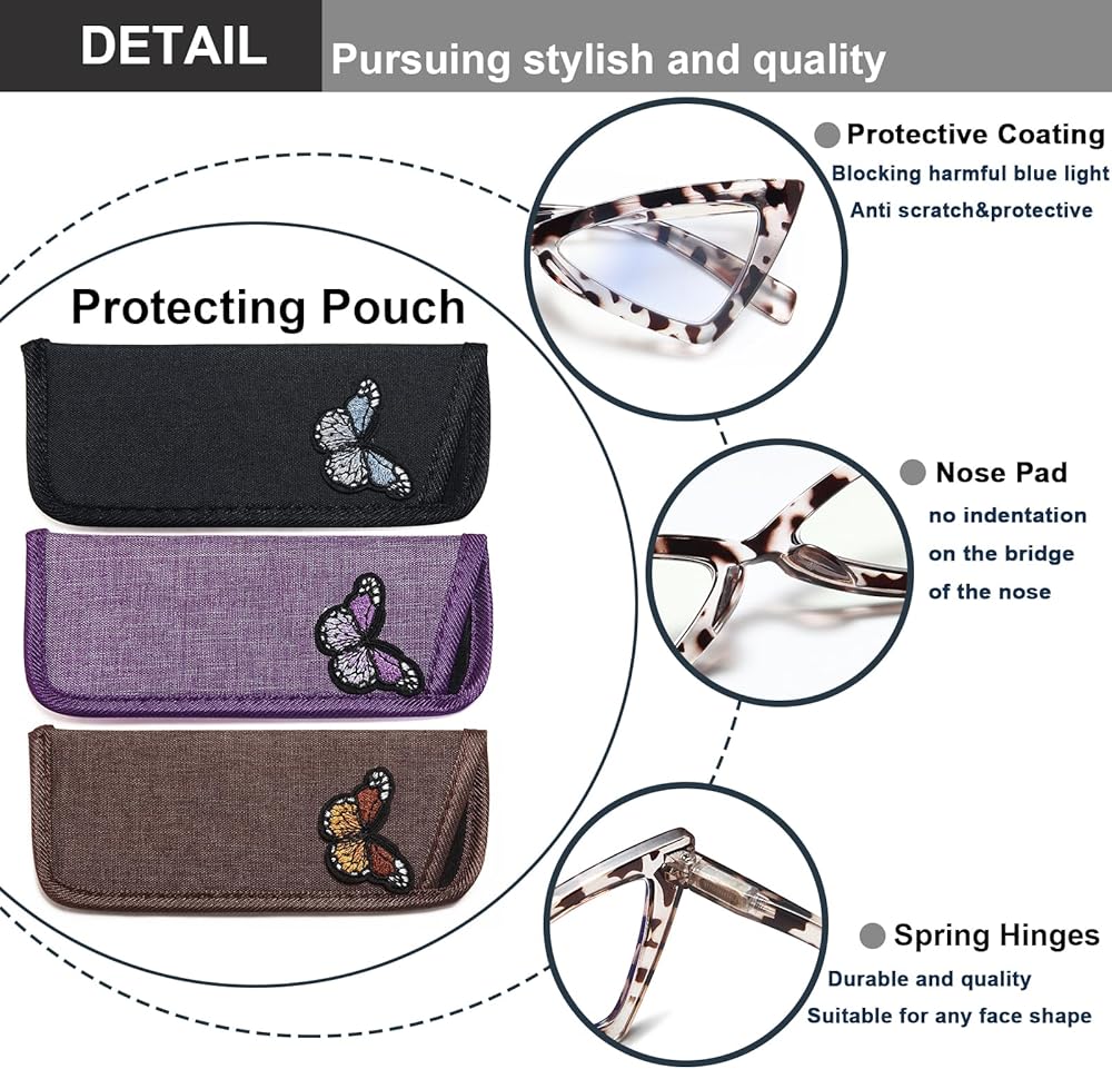 👓 【 4 عبوات من قارئات عيون القطط، عبوات مدفوعة الأجر ذات قيمة عالية】معبأة بـ 3 أزواج من نظارات قراءة عين القطط، وقماش تنظيف النظارات و3 أكياس نظارات. لا داعي للقلق بعد الآن بشأن نسيان ارتداء النظارات، يمكنك وضع واحدة في المنزل وواحدة في المكتب وواحدة في السيارة.
