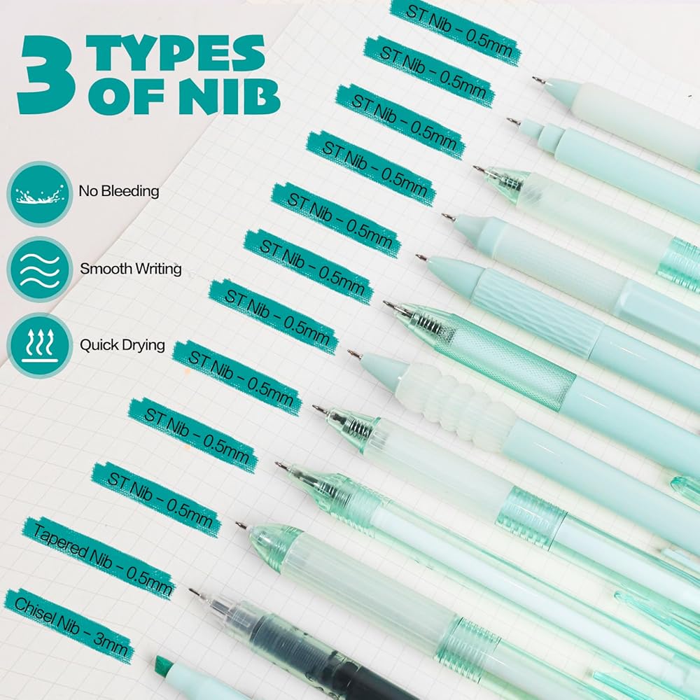 🔴خيارات أطراف متنوعة: تتضمن مجموعة أقلام الجل مجموعة من أطراف القلم: طرف ST، طرف رصاصي، طرف مخروطي CS، وطرف تمييز بعرض 3 مم، كل منها بهيكل زنبركي دقيق لتدفق حبر ثابت وكتابة دون عناء.