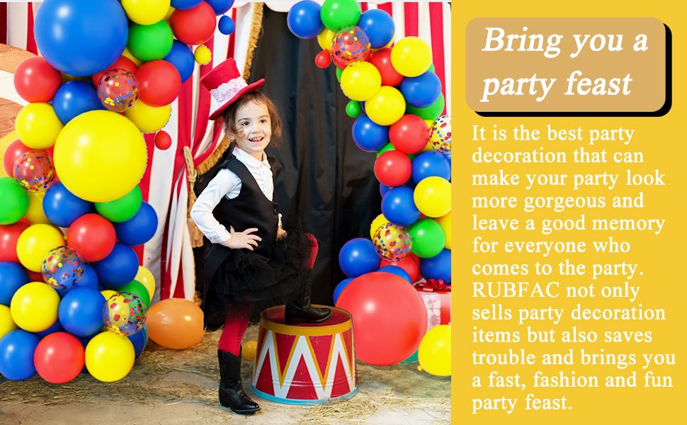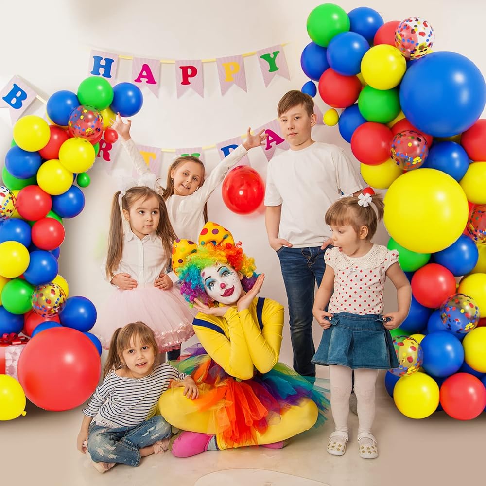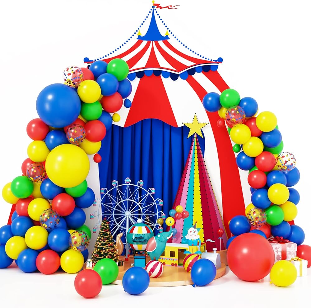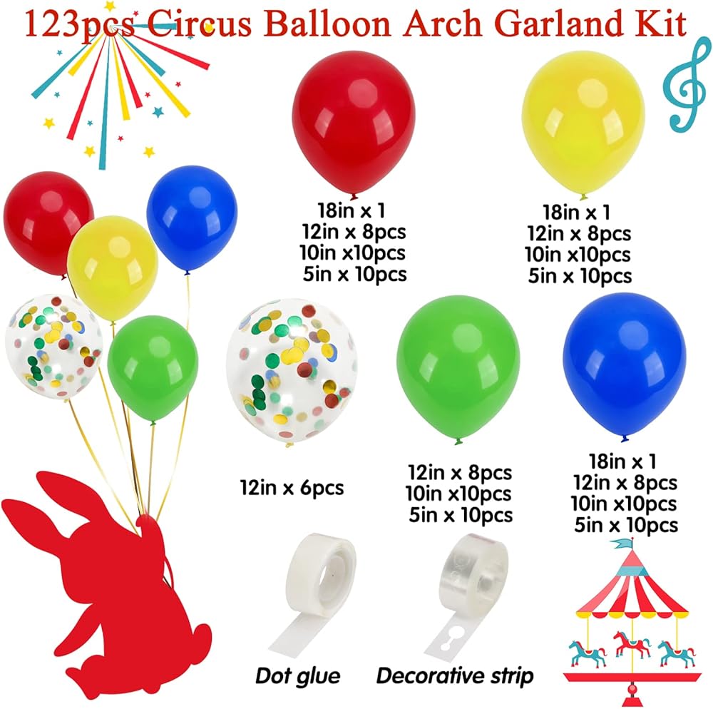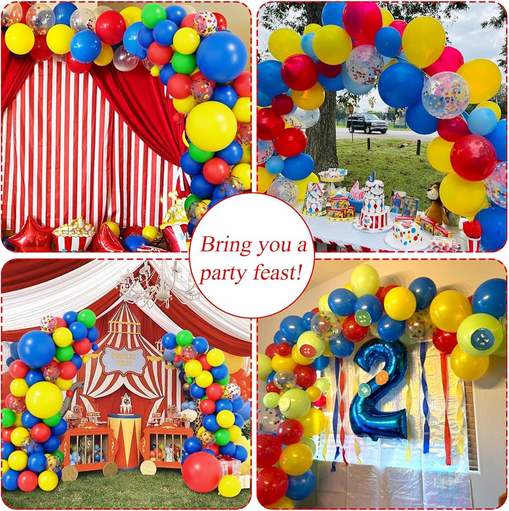 RUBFAC 123 قطعة من البالونات الأساسية كرنفال السيرك بالون قوس مجموعة إكليل، أحمر أصفر أزرق أخضر بالونات قوس قزح لوازم استحمام الطفل موضوع زينة عيد ميلاد