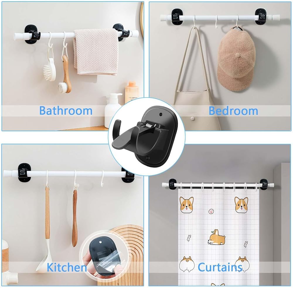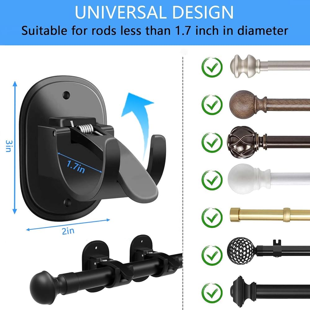 CONVENIENT QUANTITY: Each package includes 6 universal plastic self-adhesive curtain rod brackets for your everyday needs. These brackets measure approximately 3.15 x 1.89 x 2.36 inches and fit most standard shower curtain rods with a diameter of 0.62 inches to 1.5 inches. Enjoy the convenience of multiple mounting options and ensure a safe and stable curtain rod installation throughout your space.