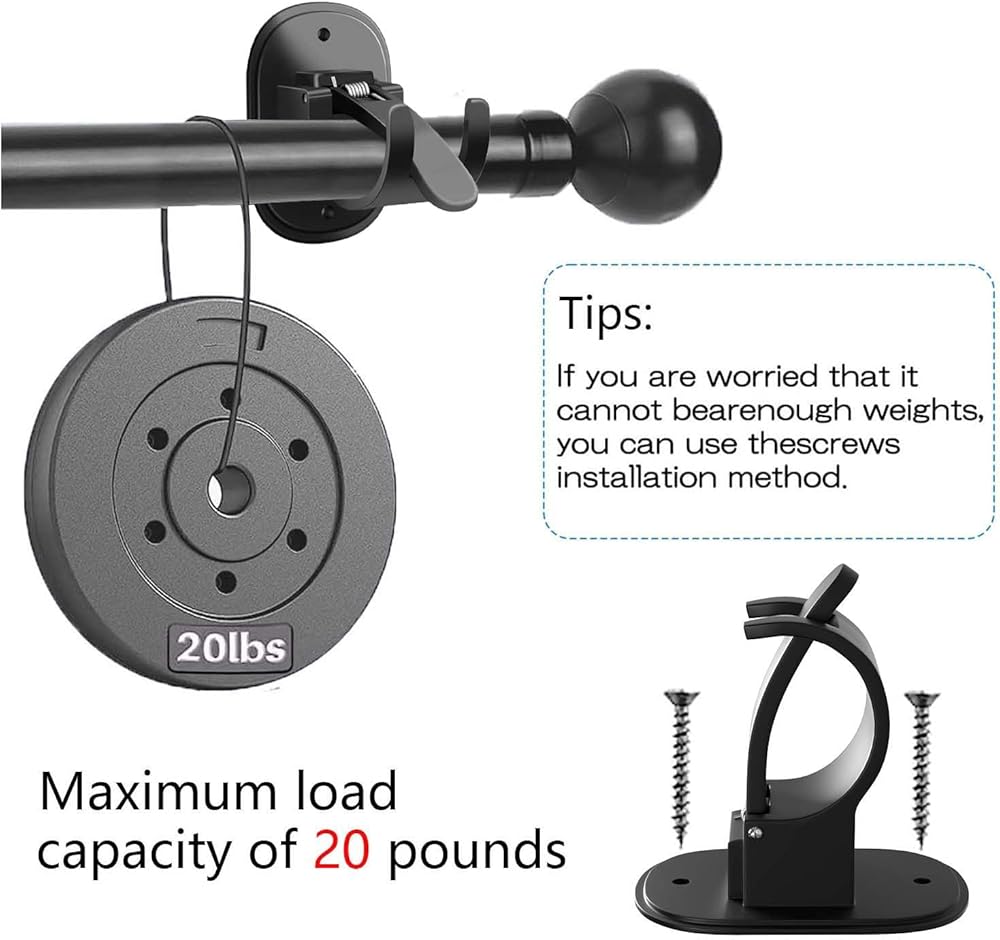 QUALITY MATERIAL: Our curtain rod brackets are made of high quality PC plastic material and stainless steel to ensure durability. These sturdy brackets have good load bearing capacity and can hold up to 20KG with just adhesive. For even more stability, you can screw them in place for a maximum weight capacity of 25 lbs. Trust our curtain rod brackets for reliable quality and solid installation.
