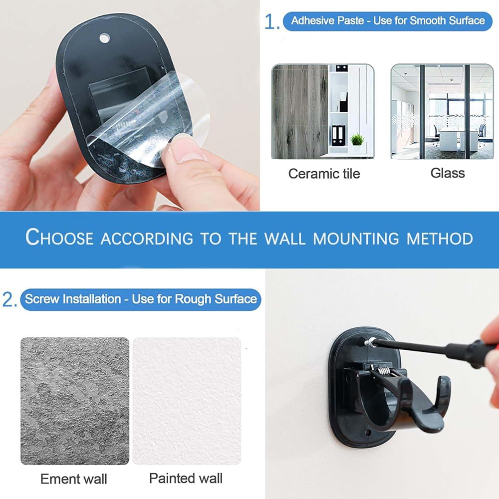 NO-DRILL MOUNTING: Say goodbye to the hassle of drilling holes in the wall with our innovative no-drill curtain rod brackets. Designed with a strong adhesive, these brackets hold your curtain rods securely in place without any tools or screws. Simply peel off the adhesive backing and stick them to smooth surfaces such as glass, tile, marble, stainless steel and more.