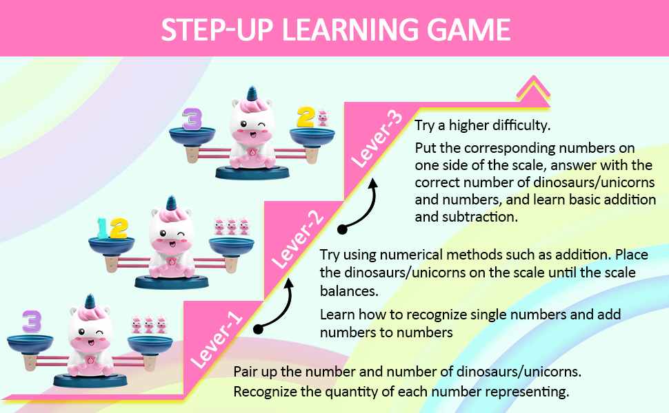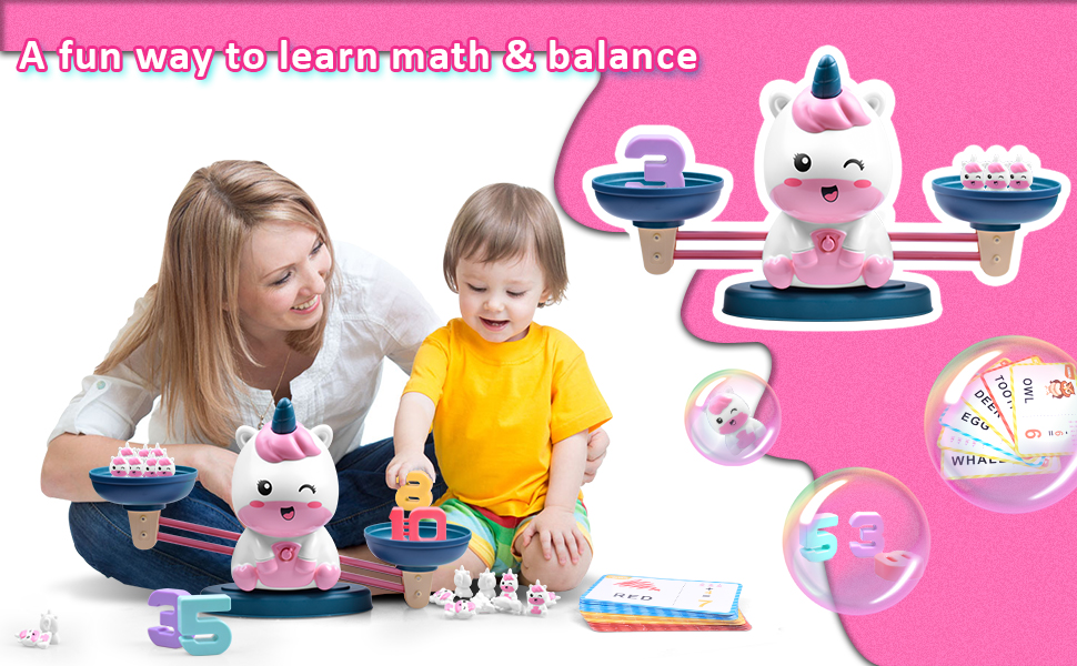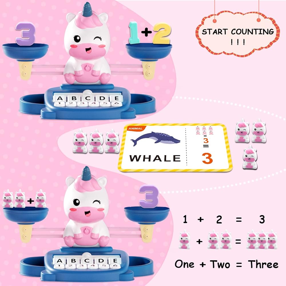 ألعاب وألعاب مونتيسوري: الألعاب التعليمية على شكل يونيكورن للأطفال من 5 إلى 7 سنوات لطيفة. يمكن للأطفال وضع مكعب الأرقام الملون على اليسار ووزن وحيد القرن الصغير على اليمين لتحقيق التوازن بين الجوانب. هذه اللعبة الجذعية للأطفال بعمر 3 4 5 6 7 سنوات مفيدة لأنشطة التعلم في مرحلة ما قبل المدرسة التي تساعد الأطفال على تحسين مهارات الرياضيات والتنسيق بين اليد والعين في عملية التفكير والتدريب العملي.