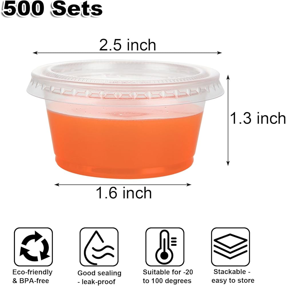 [500 مجموعة - 2 أونصة] أكواب جيلو شوت أكواب بلاستيكية مع أغطية، حاويات بهارات صغيرة، أكواب صلصة غمس للاستعمال مرة واحدة لتتبيل السلطة، أكواب سوفلي شفافة للسوفليه، عينات الطعام، الغداء، البار