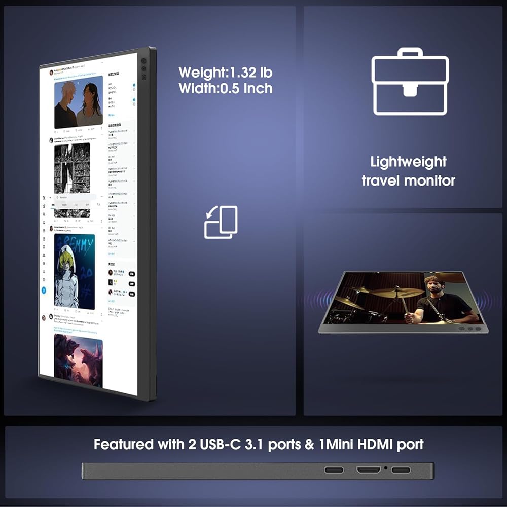 [Lightweight and Portable] Keeping in mind the portability of the monitor, we have created a lightweight and easy-to-carry screen that weighs 1.32lb and is 0.5-inch slim. Your work gets done efficiently while you are on the trip.