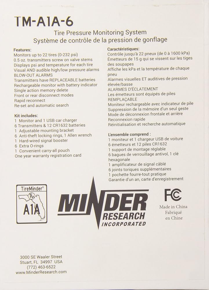 With a large, beautiful display, the TireMinder A1A tire pressure monitoring system is engineered to be a simple, yet powerful tool for monitoring tire conditions, no matter where the road takes you. Just like the original State Road A1A, the TireMinder A1A allows you to sit back and relax, winding through all of the hidden paths, while knowing your vehicle is in good hands. The A1A features straightforward visual alerts, as well as powerful audible alerts, with easy to understand icons to know exactly what type of issue is occurring and where. From boat trailer to coach, the A1A monitors up to 22 tire positions, at up to 232 PSI, covering "all that you haul. " Each one of those positions also updates on a consistent 4 minute update cycle. Not only do you get updated readings every four minutes, but the device also performs self-diagnostics every 6 seconds to instantly warn of unstable tire conditions. Besides pressure, the A1A will immediately alert if the internal tire pressure rises above 167 °F. It also features a single action search mode which pushes updates to the monitor in less than 10 minutes. The A1A also offers front or rear disconnect modes. Separating a towing vehicle from a towed trailer, 5th wheel, car, etc. , is quick and easy. A simple press of two buttons allows for temporary disconnect as well as reconnect when the two pieces are re-united. The TM-A1A kits come with a Rhino Signal Booster (to eliminate electronic interference) 6 screw on transmitters, and more (extra batteries, "O" rings, bracket, anti-theft locking nuts, carrying case, free lithium battery exchange program and unlimited "live" phone/email support). TireMinder , the multi-year gold medal award winning TPMS!