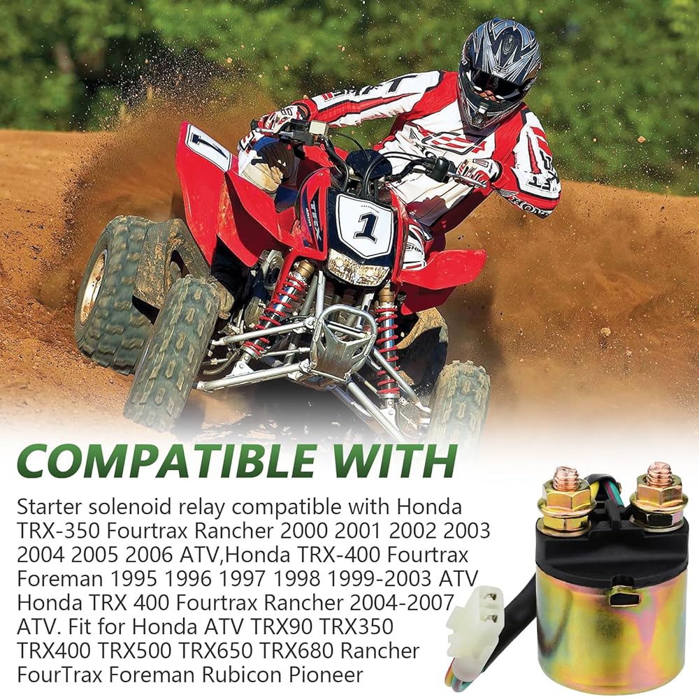 • 【Compatibility】Starter solenoid relay compatible with Honda TRX-350 Fourtrax Rancher 2000 2001 2002 2003 2004 2005 2006 ATV,Honda TRX-400 Fourtrax Foreman 1995 1996 1997 1998 1999-2003 ATV, Honda TRX 400 Fourtrax Rancher 2004-2007 ATV. Fit for Honda ATV TRX90 TRX350 TRX400 TRX500 TRX650 TRX680 Rancher FourTrax Foreman Rubicon Pioneer.