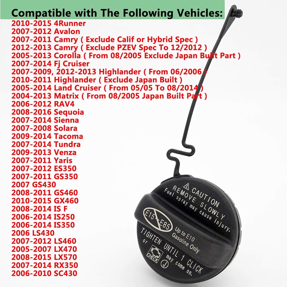 • The gas cap compatible with 2010-2015 4Runner,2007-2012 Avalon,2007-2013 Camry,2005-2013 Corolla,2007-2014 Fj Cruiser,2007-2013 Highlander,2005-2014 Land Cruiser,2004-2013 Matrix,2006-2012 RAV4,2008-2016 Sequoia,2007-2014 Sienna,2007-2008 Solara,2009-2014 Tacoma,2007-2014 Tundra,2009-2013 Venza,2007-2011 Yaris fuel cap / gas cap Assembly.