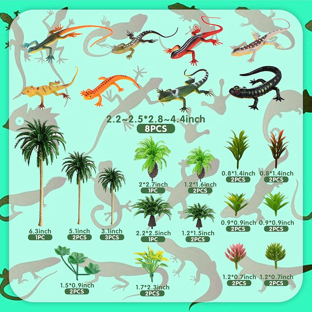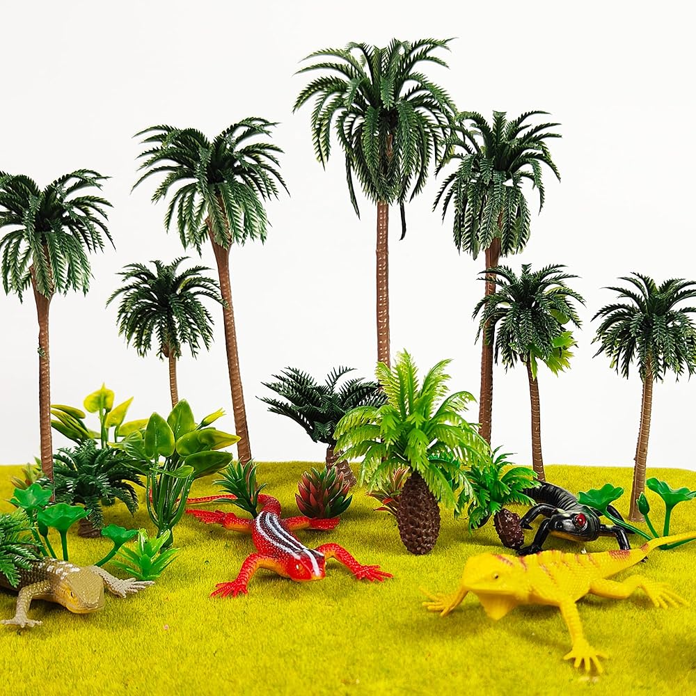 【Package Contents】 8 lizards(random colors), 6 high coconut trees, 6 low coconut trees, 16 small plants.