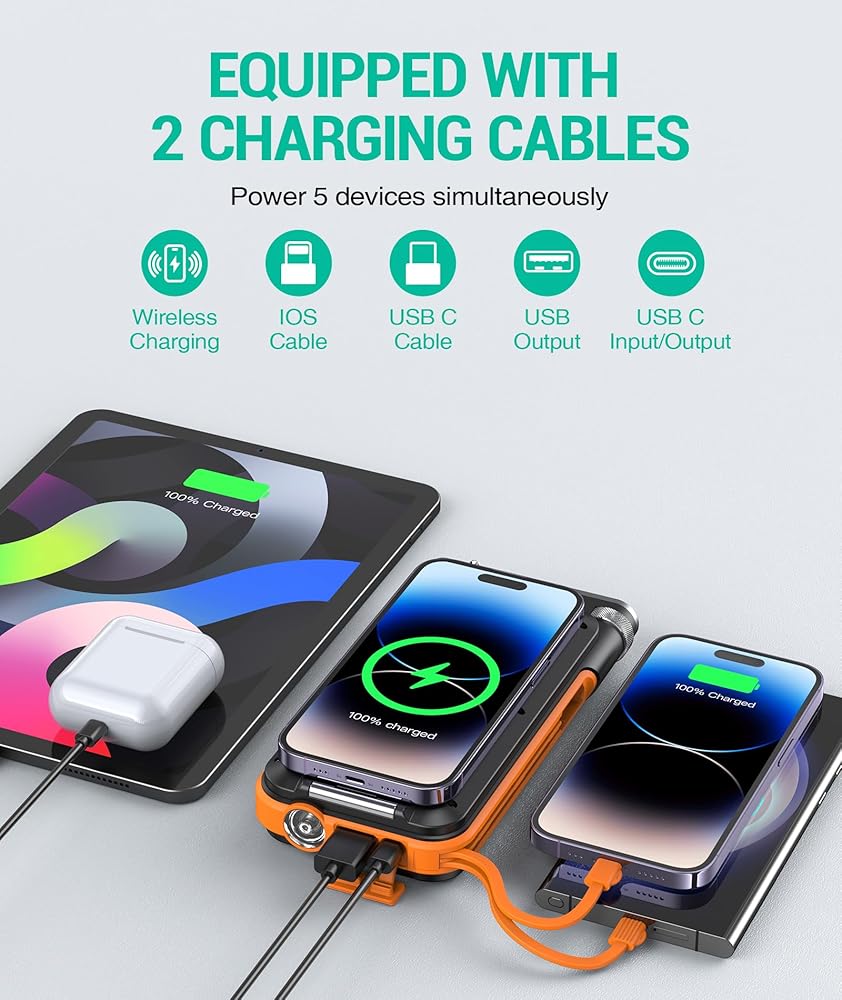 【كابلان مدمجان】: يمكن لبنك الطاقة اللاسلكي هذا شحن ما يصل إلى 5 أجهزة في وقت واحد. يأتي مزودًا بكابلات شحن USB-C وLightning مدمجة، إلى جانب منفذ USB-C متطور ثنائي الاتجاه وسريع الشحن ومنفذ USB-A 5V/3A لتعزيز كفاءة الشحن وتلبية الاحتياجات المختلفة.