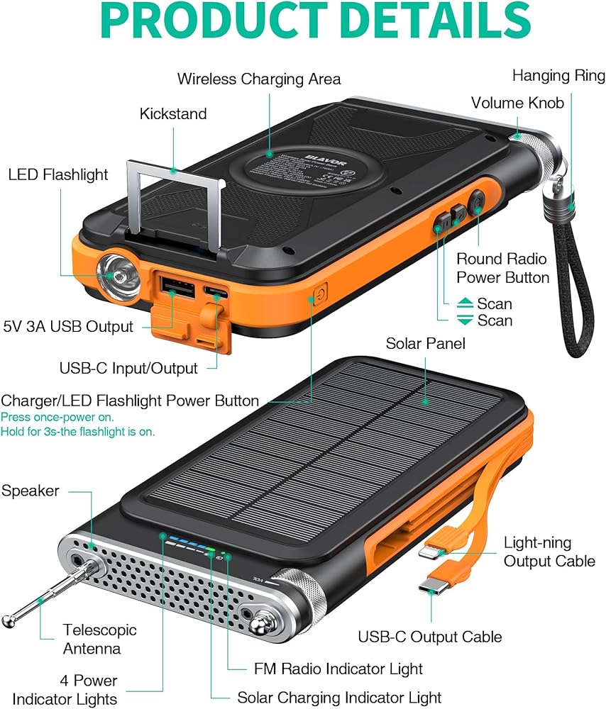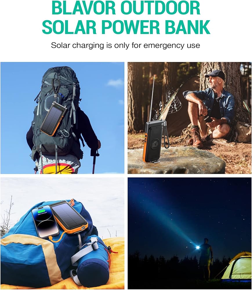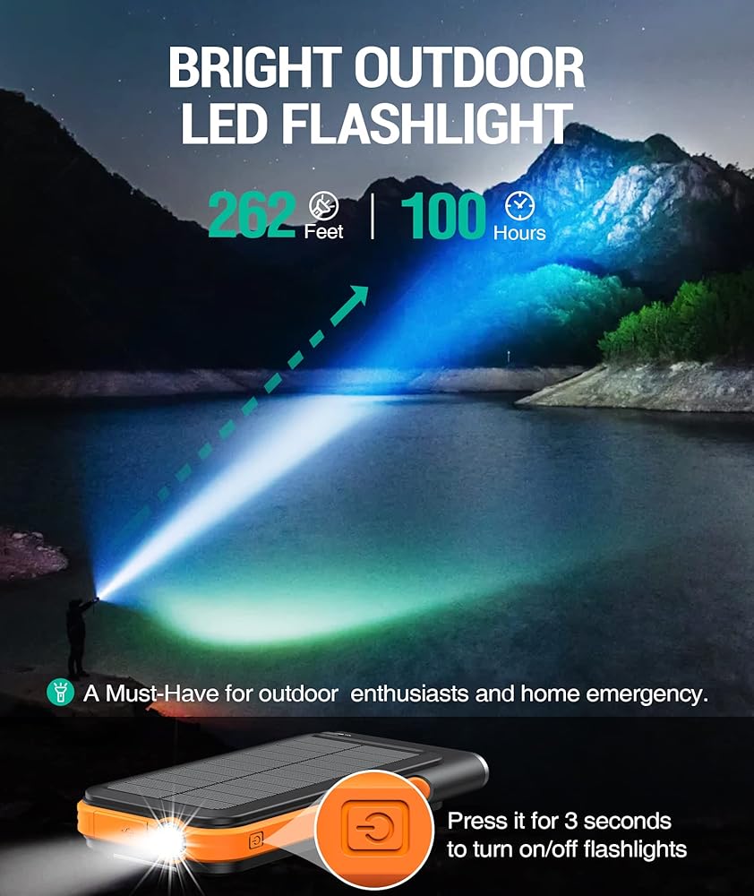 【تصميم خارجي متين】: مصباح يدوي ساطع لإضاءة الظلام، قادر على العمل لمدة تصل إلى 100 ساعة بشحن كامل. IP65 مقاوم للماء/الصدمات/الغبار، مثالي لعشاق الهواء الطلق. يعتبر الشاحن الشمسي المحمول مثاليًا للتخييم وصيد الأسماك والمشي لمسافات طويلة والمزيد.