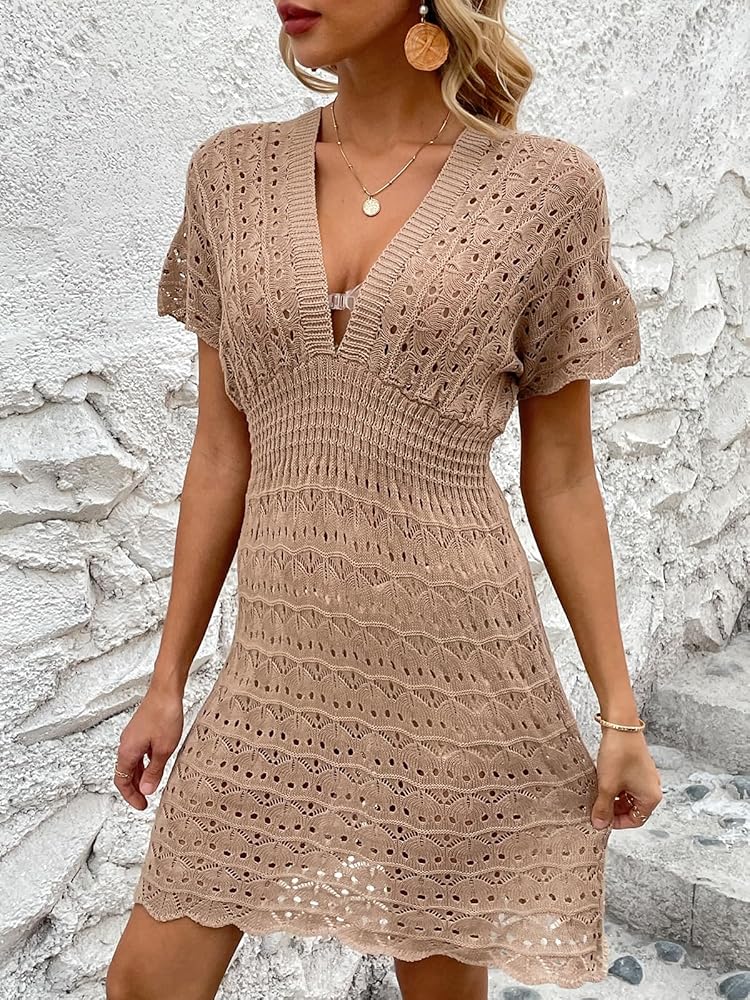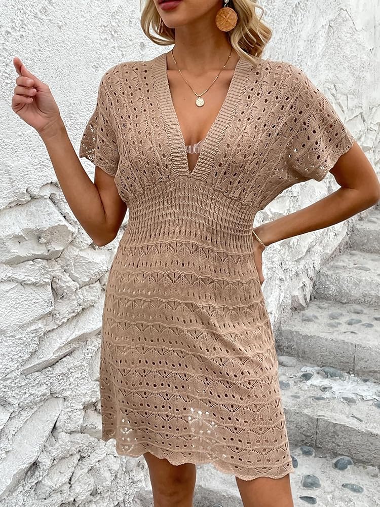 【تصميم فريد】تم تصميم أغطية ملابس السباحة للنساء بأكمام طويلة، ورقبة على شكل حرف V، وكتف منسدل، ولون ثابت، وتجويف كروشيه، وطول فستان قصير، وملاءمة مريحة يمكن أن تناسب معظم أنواع الجسم.