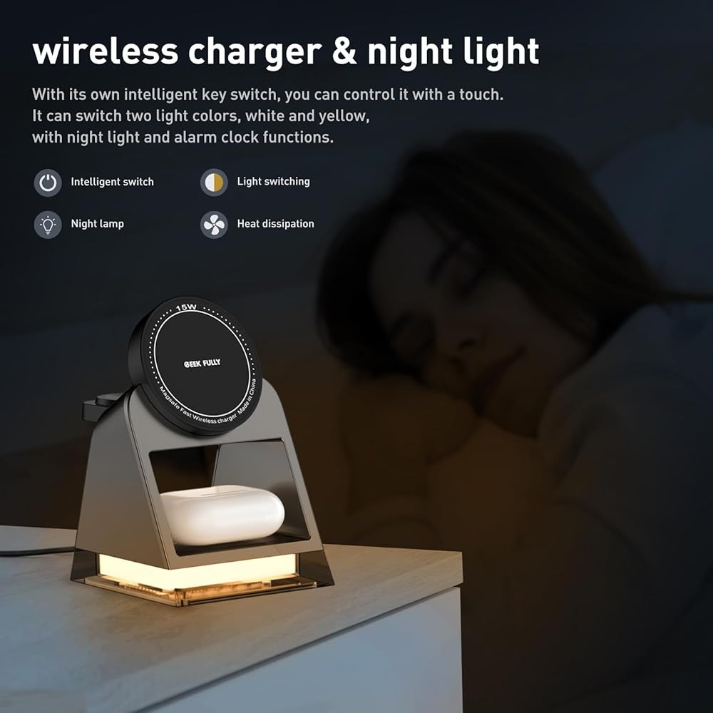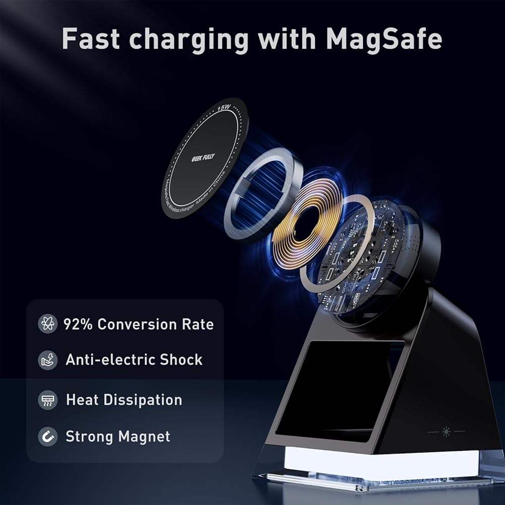 【ما ستحصل عليه】GEEK FULLY 1* 3 في 1 شاحن لاسلكي مغناطيسي، 1 * كابل من النوع C، 1 * دليل المستخدم وخدمة عملاء ودية على مدار 7 أيام/24 ساعة. إليك أفضل محطة شحن لاسلكية لهاتفك وAirPods وساعة Apple، إذا كانت لديك أي مشكلات، فيرجى الاتصال بنا وسنحلها في غضون 24 ساعة.