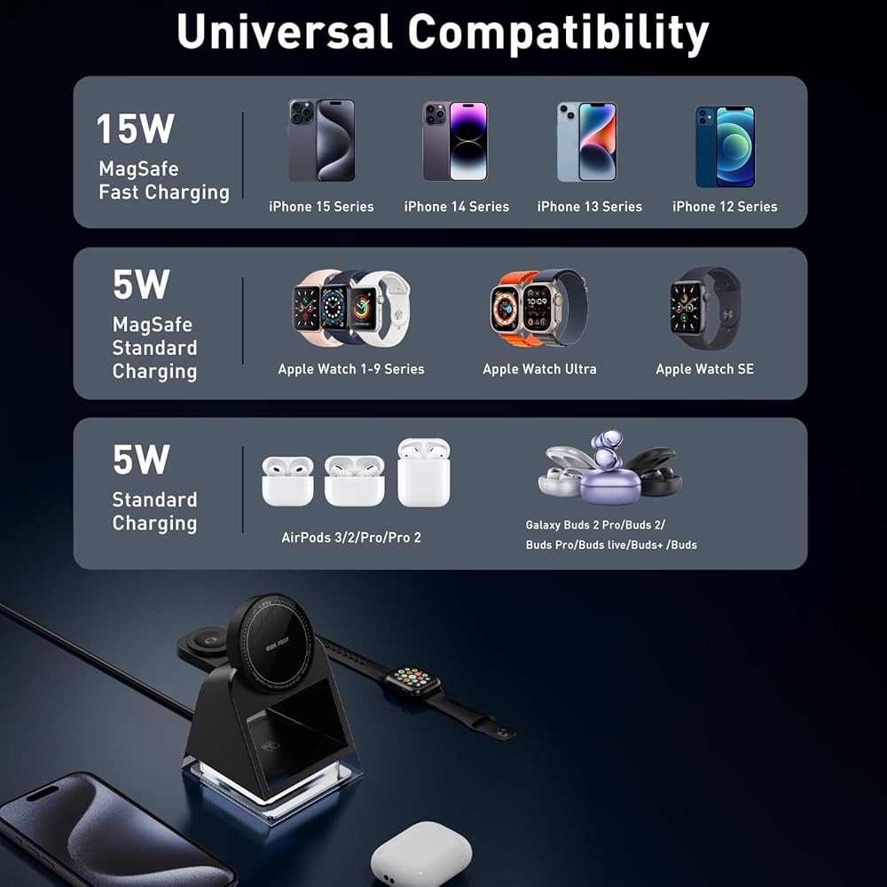 【شاحن لاسلكي 3 في 1】يدمج هذا الشاحن اللاسلكي 3 في 1 ثلاث وحدات شحن للهواتف المحمولة وسماعات الرأس والساعات، مع طاقة قصوى تبلغ 15 وات لشحن الهاتف الخلوي، و5 وات لشحن Airpods، و3 وات لشحن iWatch، مريح وفعال، ويحل مشكلة شحن أجهزة متعددة بشكل مثالي. اجعل منضدة منزلك/مكتبك/غرفة الاجتماعات أكثر توفيرًا للمساحة ومرتبة.