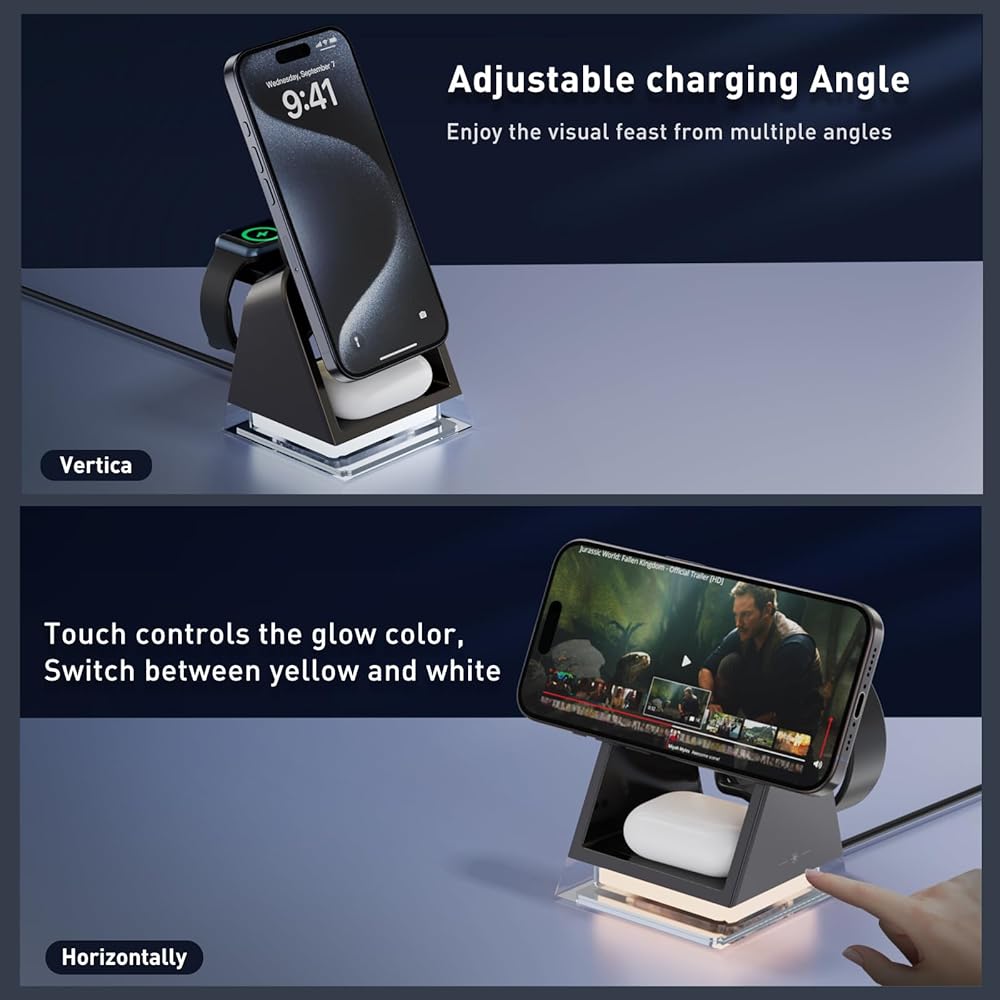 【مفهوم تصميم جديد】لا تتمتع منتجاتنا بمظهر مذهل فحسب، بل أيضًا تولي المزيد من الاهتمام للتصميم العملي، والتصميم البسيط وليس البسيط، بحيث يكون المنتج أكثر ملمسًا. تم تصميم كل زاوية بعناية لتكون مريحة وتمتزج بشكل مثالي مع المشهد. بالإضافة إلى وظيفة الشحن اللاسلكي 3 في 1، أضفنا أيضًا وضع الإضاءة على هذا الأساس، والذي يمكن تعديله عن طريق التحكم الذكي باللمس.