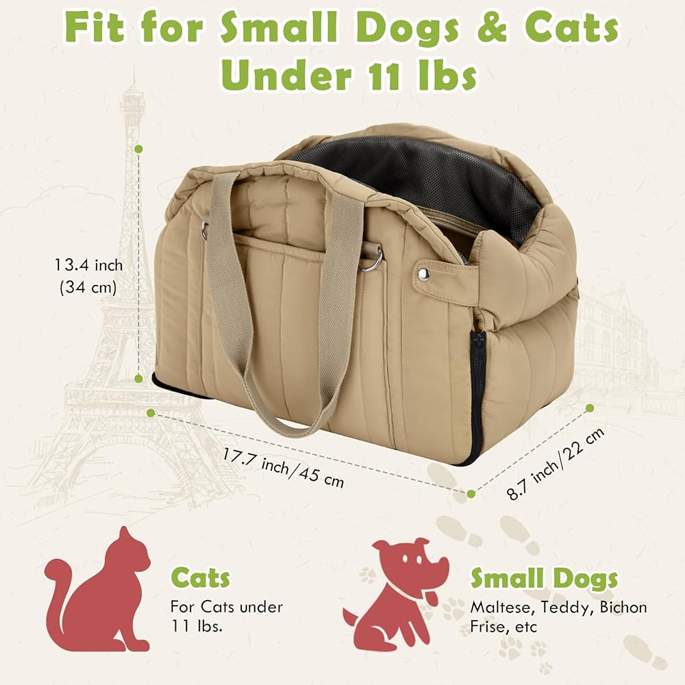مقعد سيارة للحيوانات الأليفة للجرو أو القطط - يبلغ حجم مقعد السيارة 17.7 بوصة طولًا × 8.7 بوصة عرضًا × 13.4 بوصة ارتفاعًا، ويُوصى به للكلاب والقطط الصغيرة التي يقل وزنها عن 11 رطلًا. من السهل تركيبه على السيارة أو حمله باليد أو الكتف فقط. إنها مثالية لأخذ حيوانك الأليف أثناء رحلة طويلة. وسادة مدمجة ناعمة ومريحة للاستخدام في جميع المواسم، جانب واحد مصنوع من مادة البوليستر، مناسب للحفاظ على البرودة، والجانب الآخر مصنوع من مادة شعر الخراف، مناسب للحفاظ على الدفء.