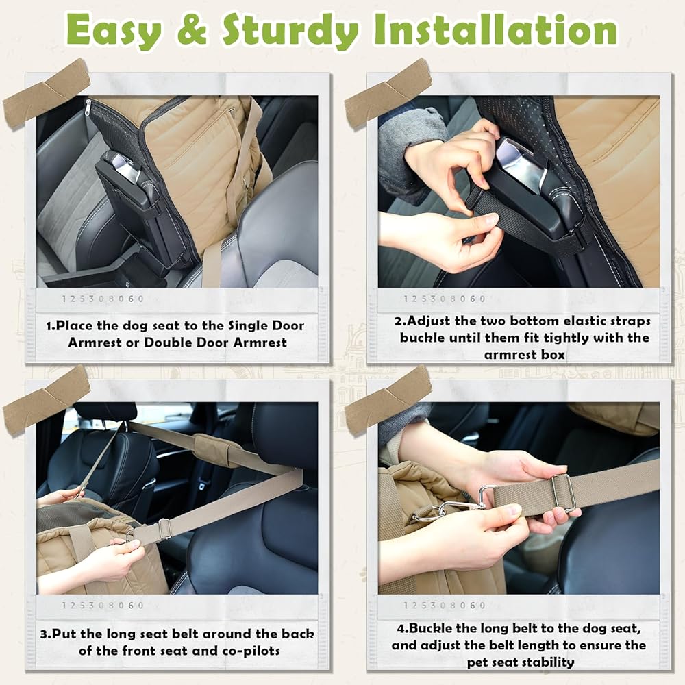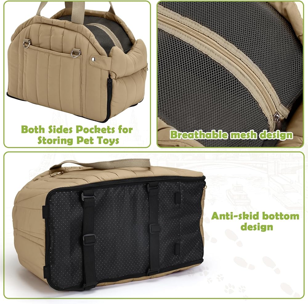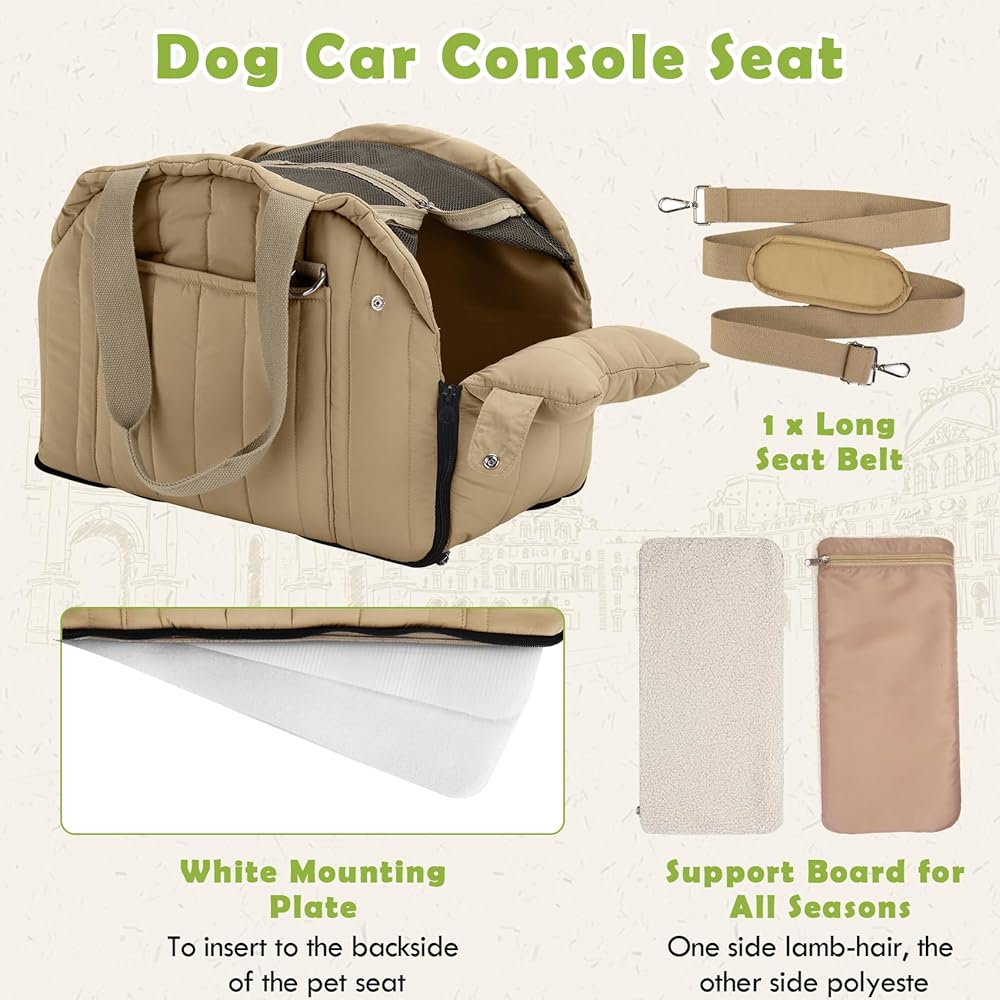 مقعد سيارة للكلاب، مقاعد معززة للكلاب الصغيرة، مقعد سيارة معزز للقطط الأليفة على مسند ذراع السيارة مع سلك أمان وجيب تخزين للكلاب الصغيرة والقطط التي يقل وزنها عن 11 رطل (كاكي)