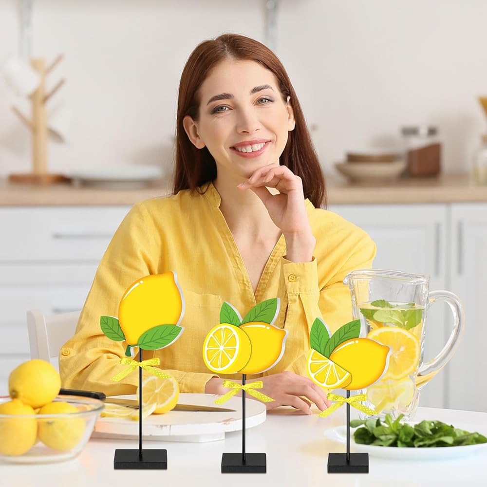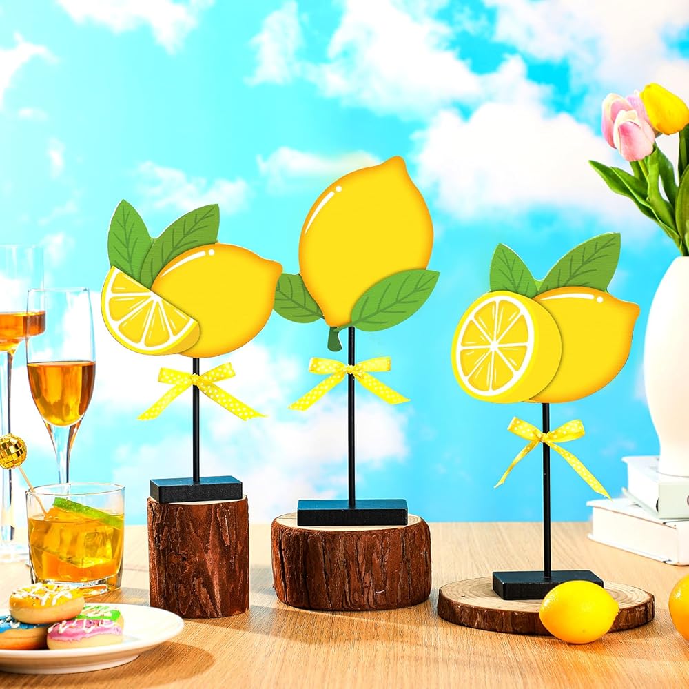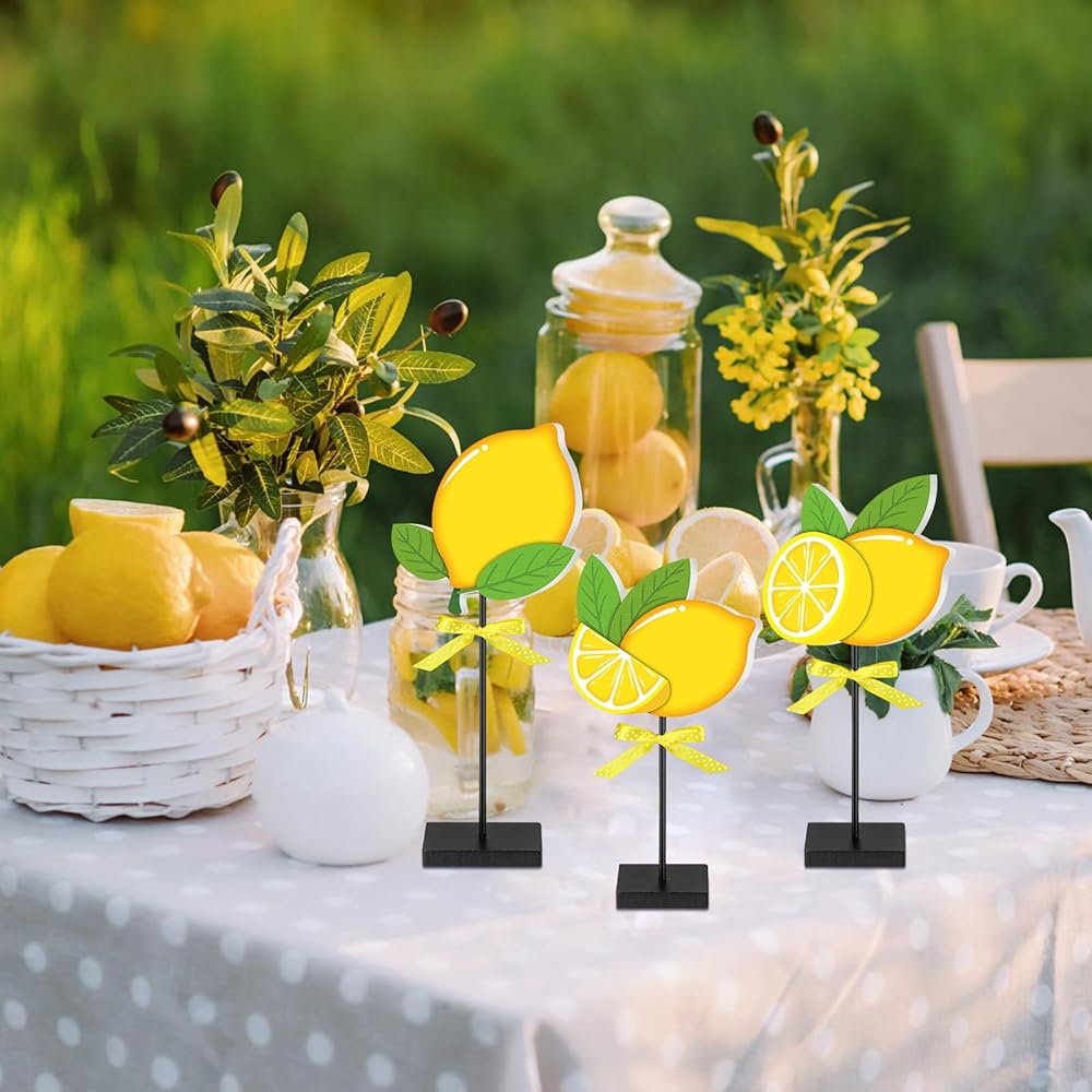 3 قطع منضدية خشبية ليمونية صيفية لديكور المنزل، علامة طاولة خشبية ليمونية، قطعة مركزية خشبية ريفية، قطعة مركزية ليمونادة طازجة طويلة القامة، ديكورات للمطبخ الريفي في المزرعة